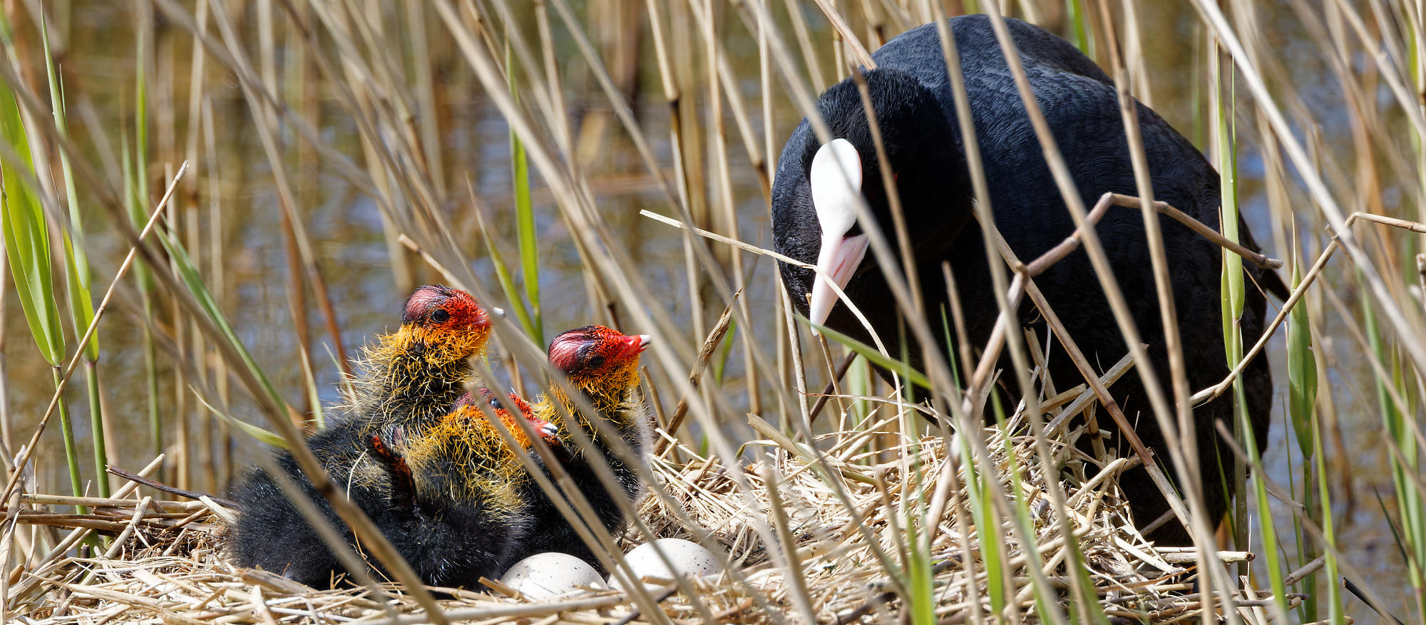 Les foulques, comme la plupart des oiseaux, sont moins farouches à Texel. Il est facile de voir des nids à quelques mètres de la route, en bordure des petits canaux d’eau. Quatre petites têtes rouges ont éclos dans ce nid, [...]