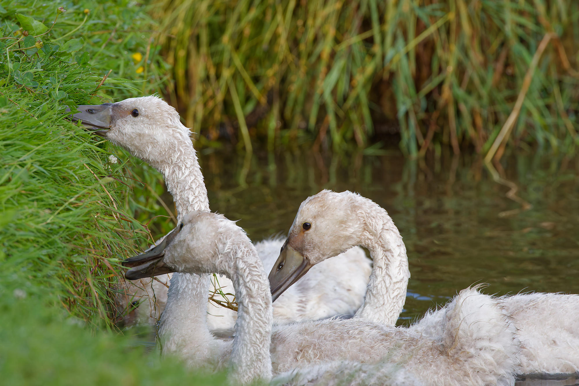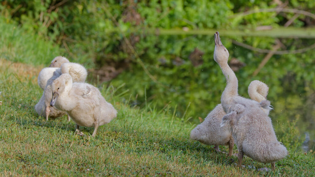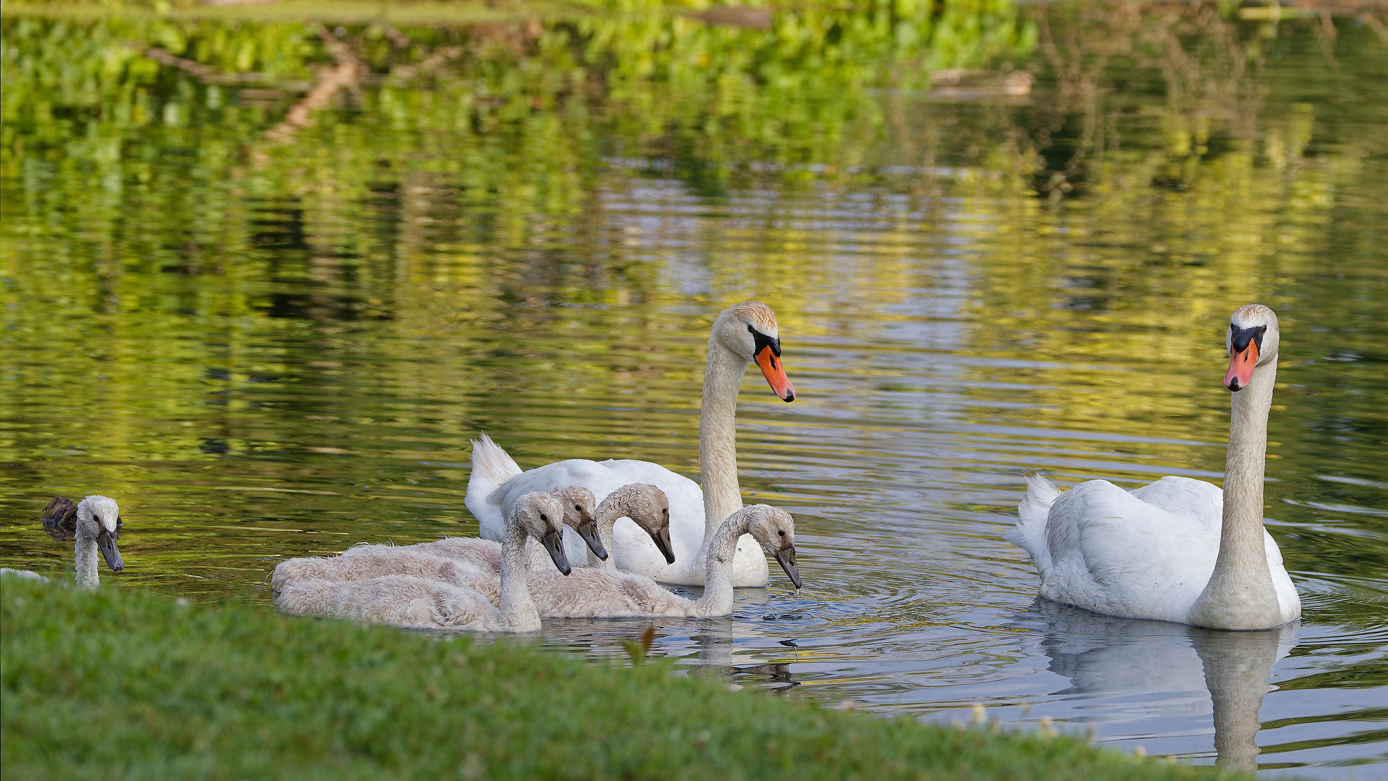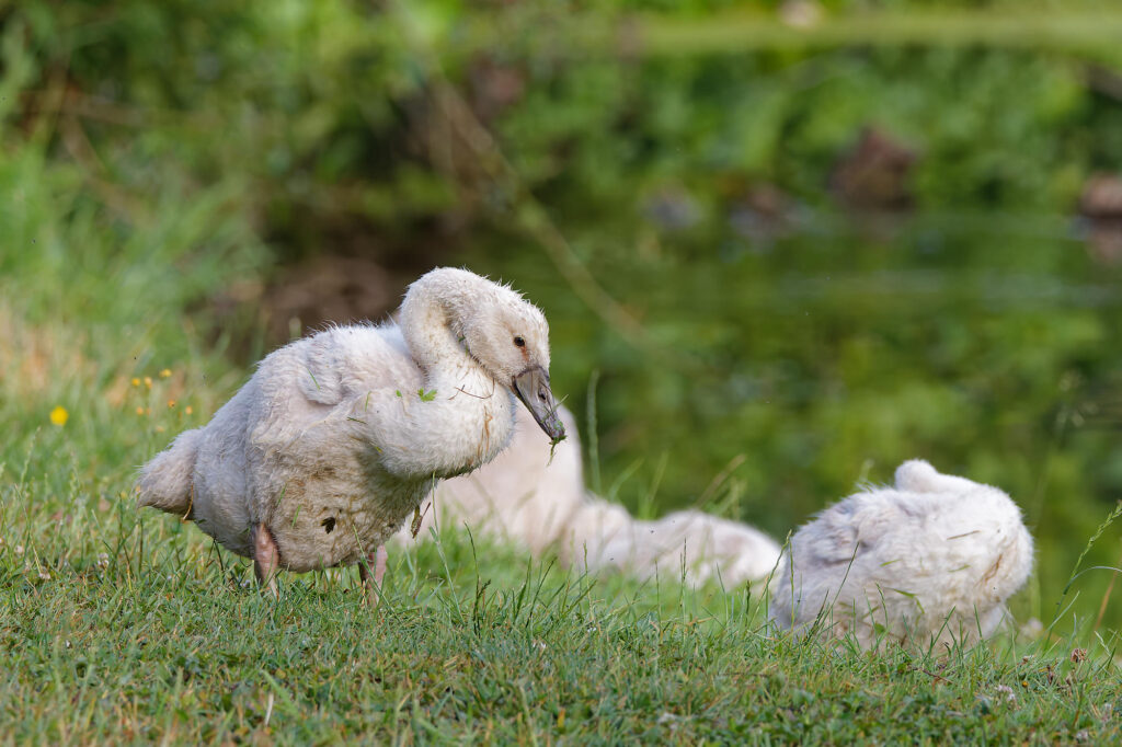 L’herbe bien verte de la rive complète leur régime de plantes aquatiques.
