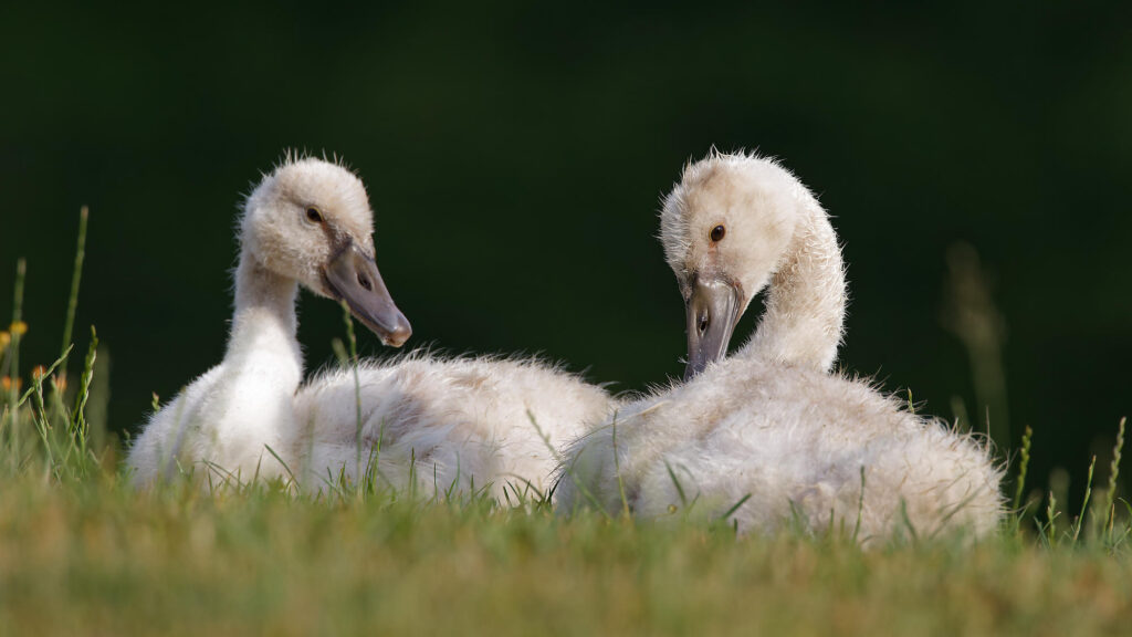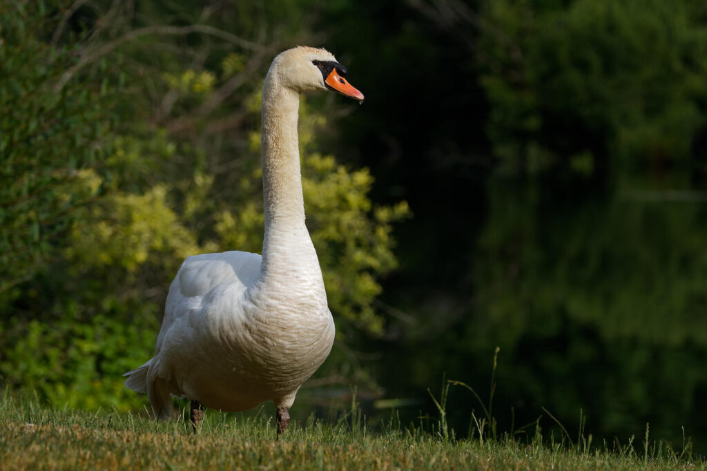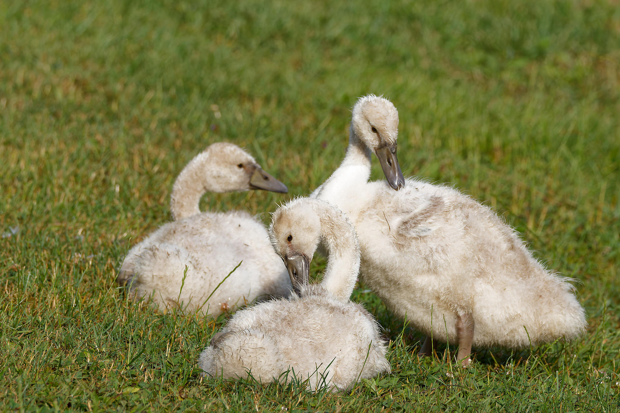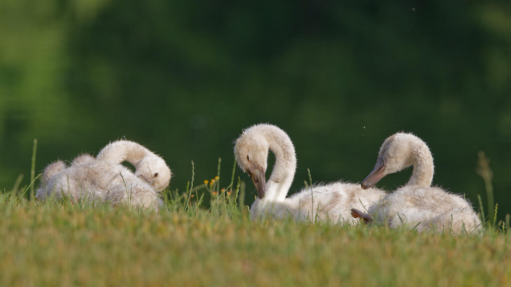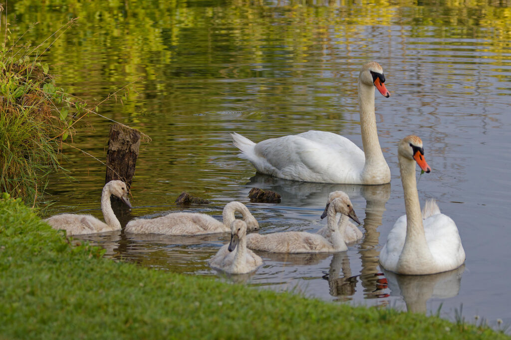 L’herbe bien verte de la rive complète leur régime de plantes aquatiques.