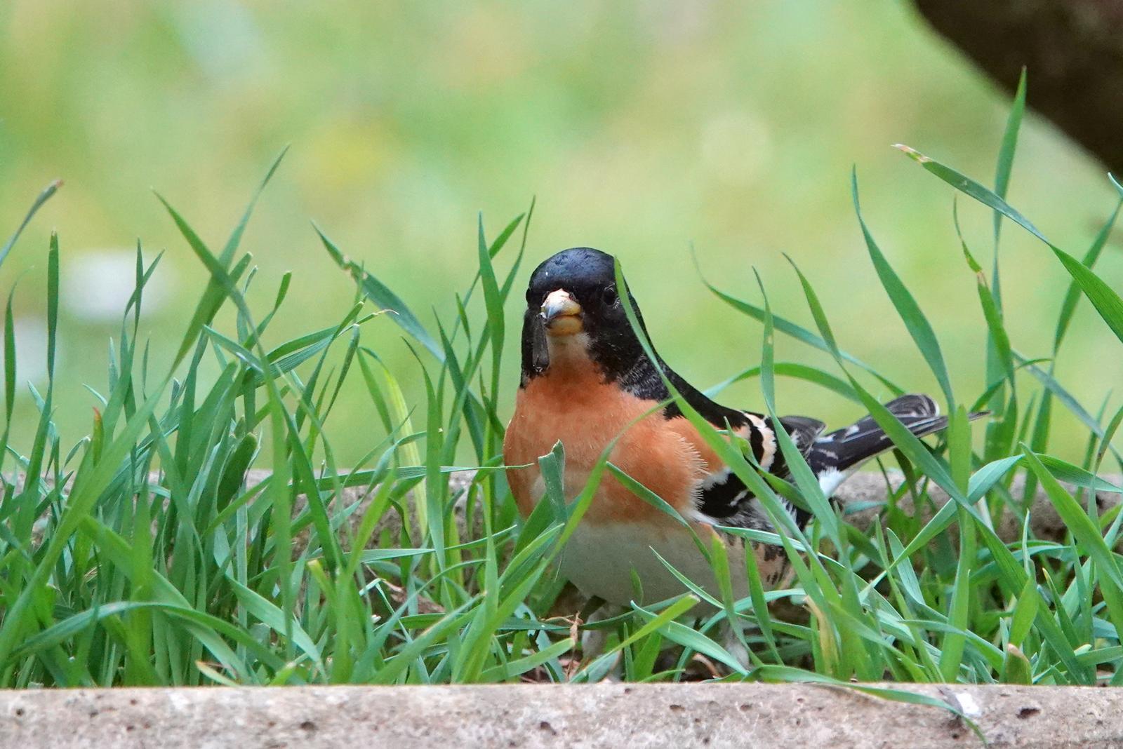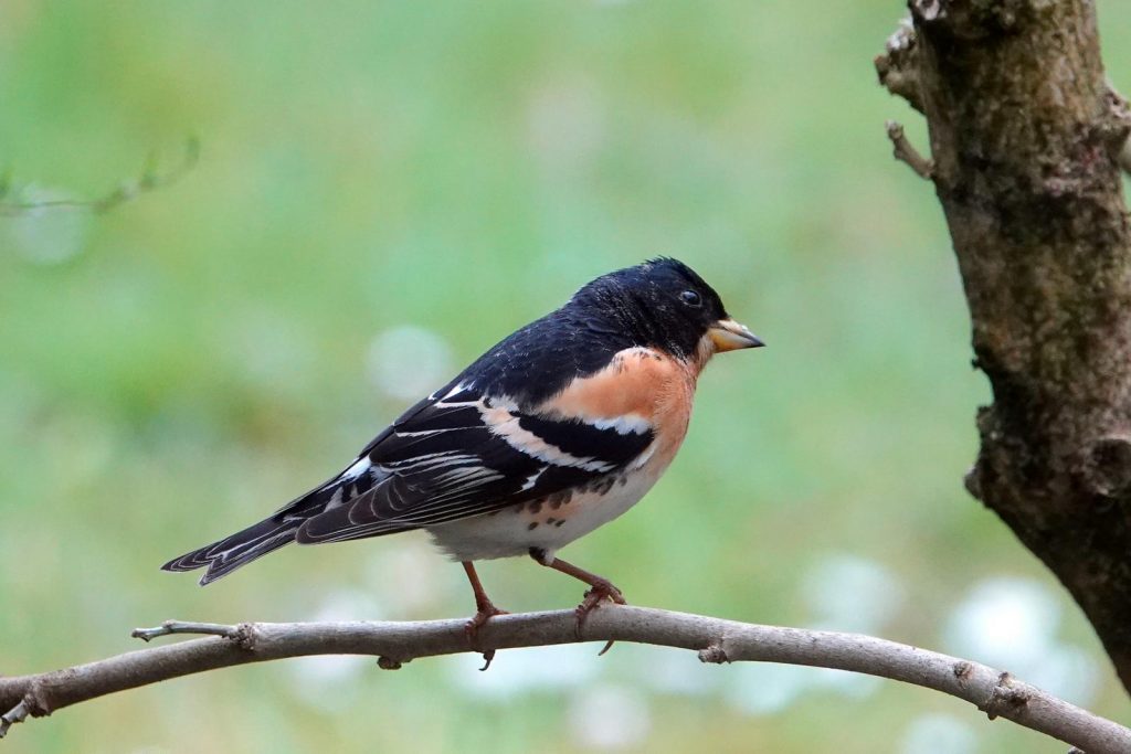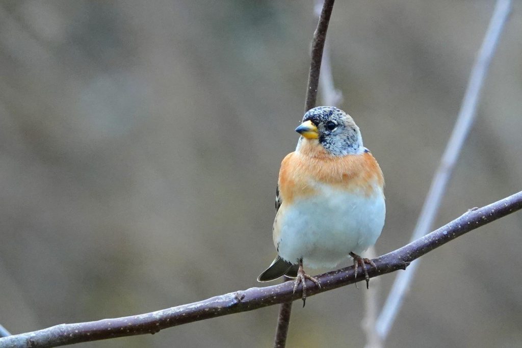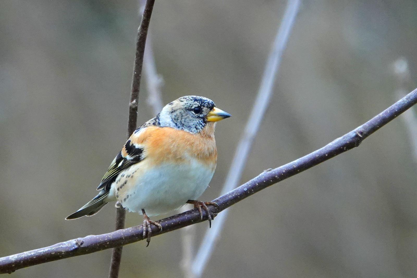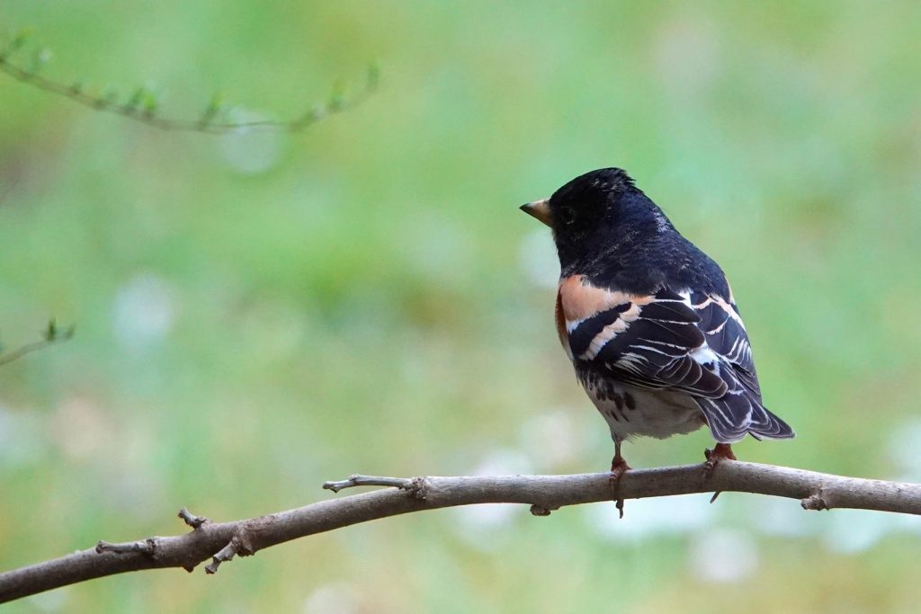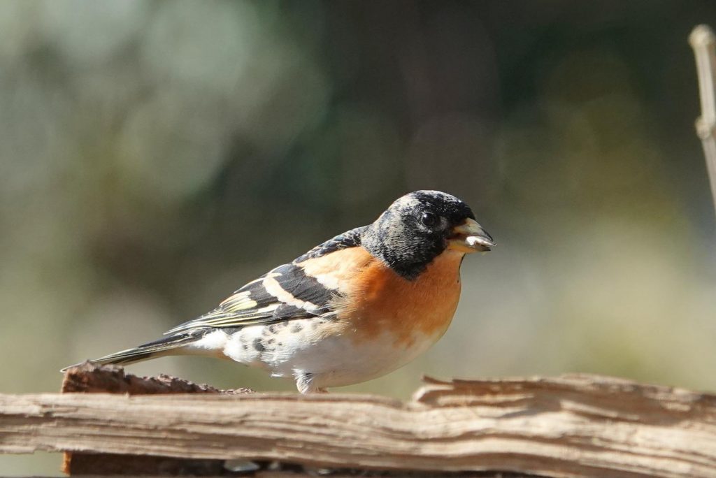 A la fin de l’hiver, les pinsons du nord se parent de leur plumage nuptial, et les mâles sont alors très reconnaissables avec leur capuche toute noire contrastant avec leur poitrine saumon.