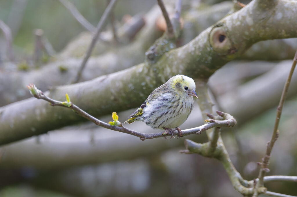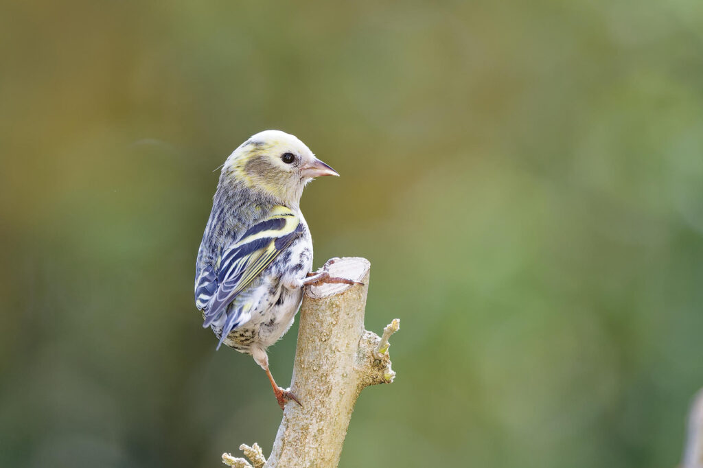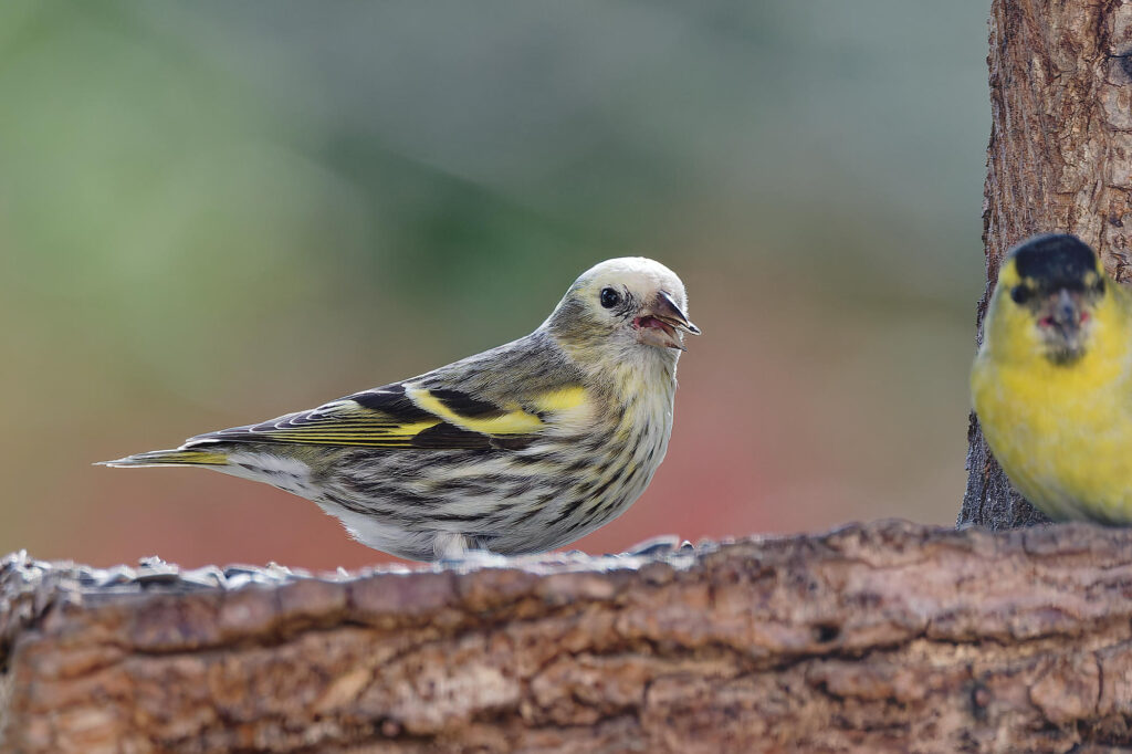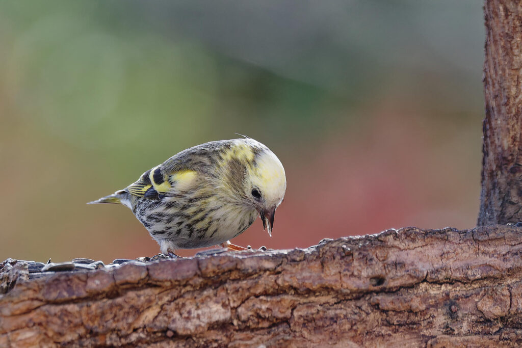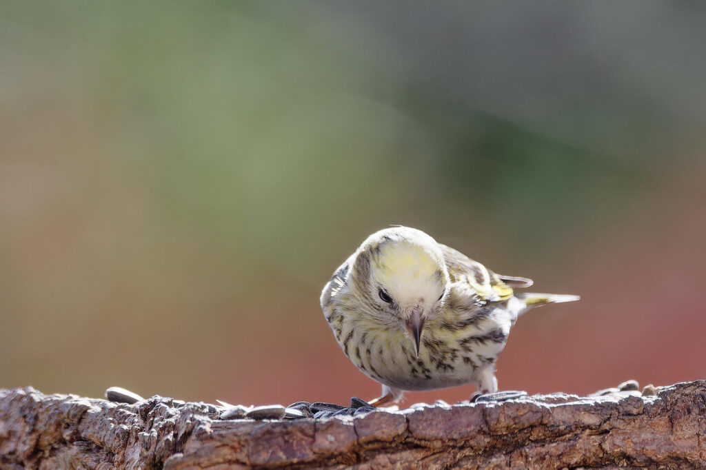 une petite femelle tarin unique parmi la trentaine qui a visité la mangeoire ce printemps.