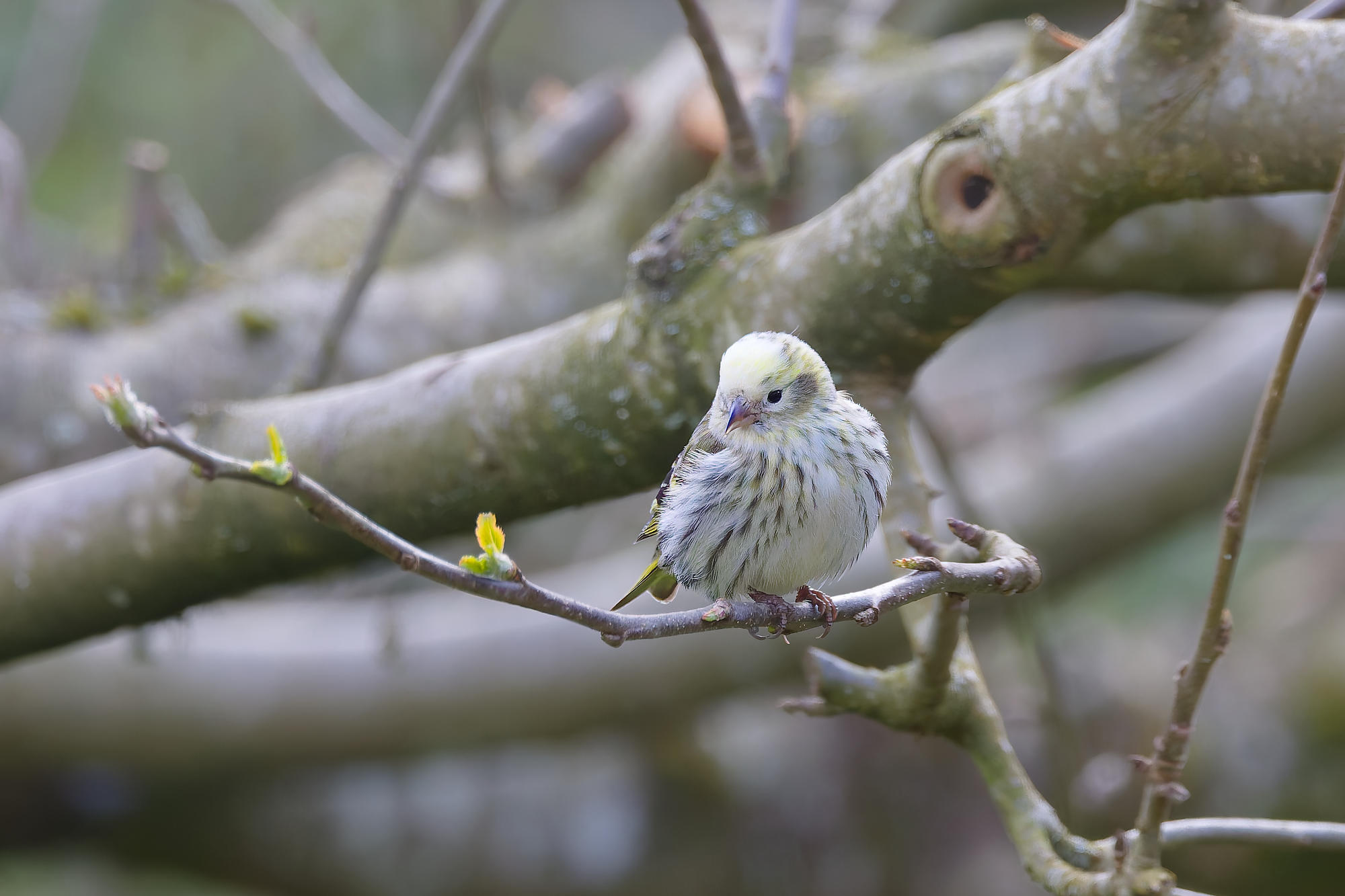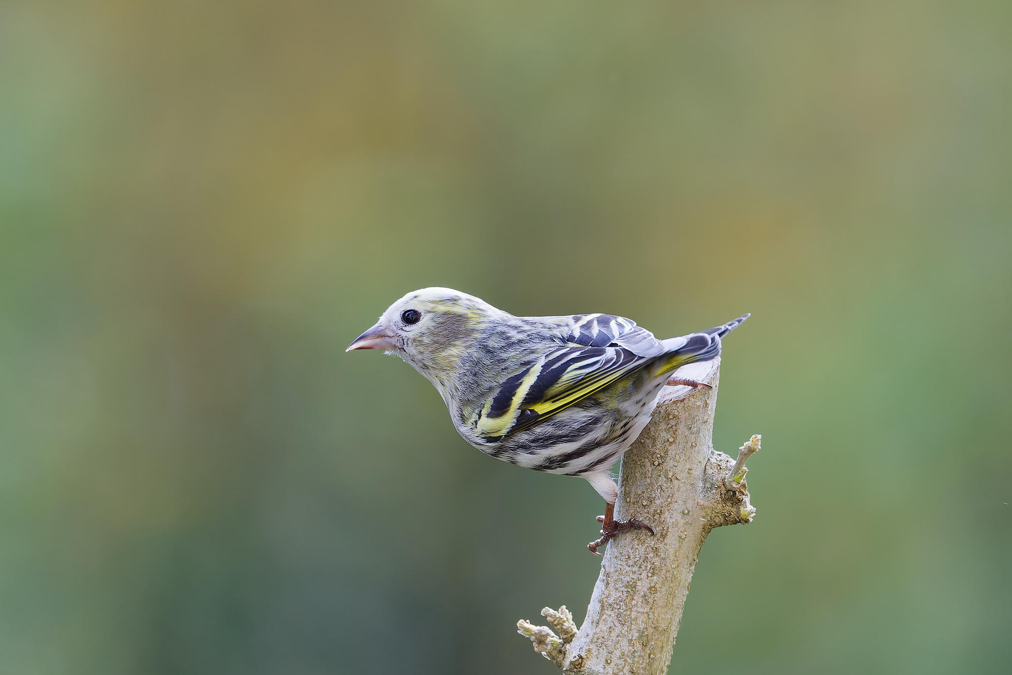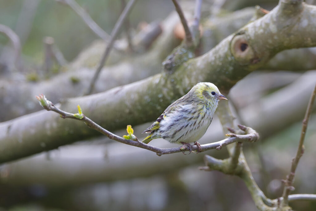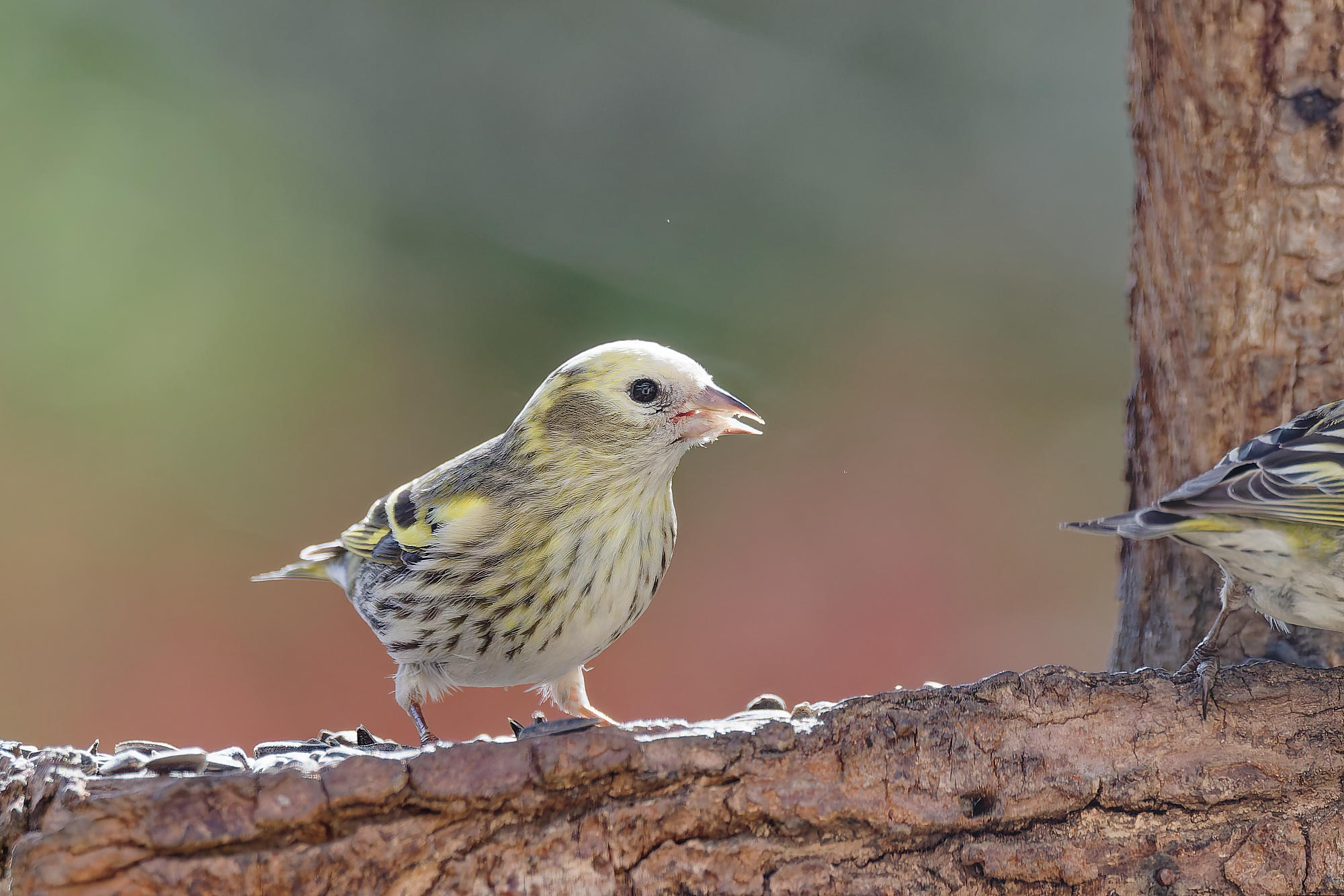 une petite femelle tarin unique parmi la trentaine qui a visité la mangeoire ce printemps.