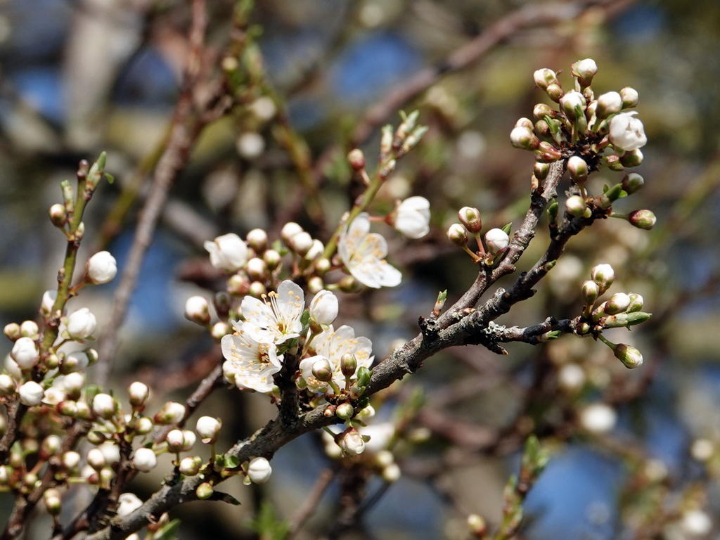 Les haies sauvages de prunelliers blanchissent à l’approche du mois de mars. Des milliers de petits boutons blancs apparaissent, qui deviennent autant de magnifiques et éphémères fleurs blanches, aux multiples étamines.