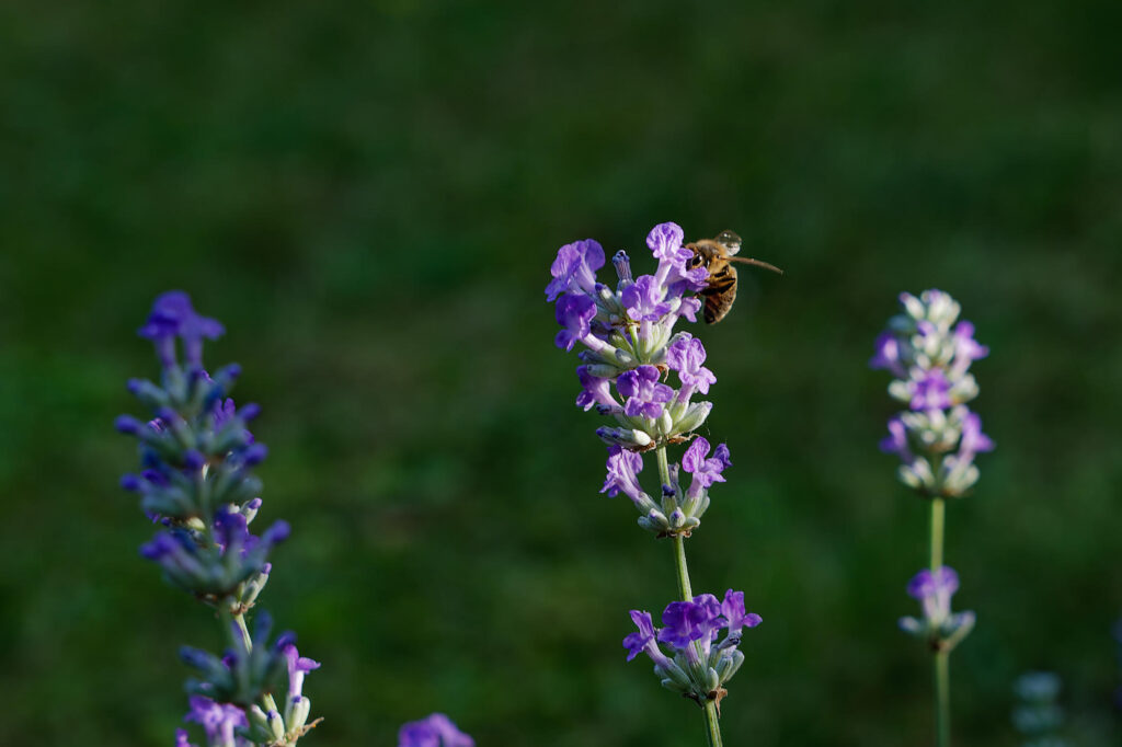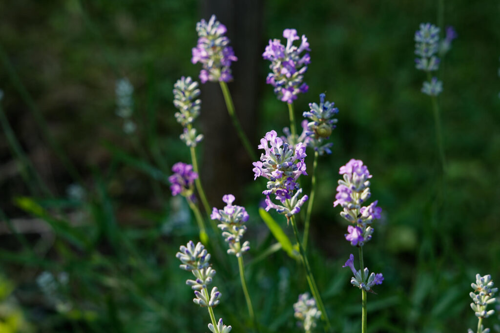 Ses fleurs bleues-mauves captent le soleil de fin d’après-midi et le renvoient avec douceur.