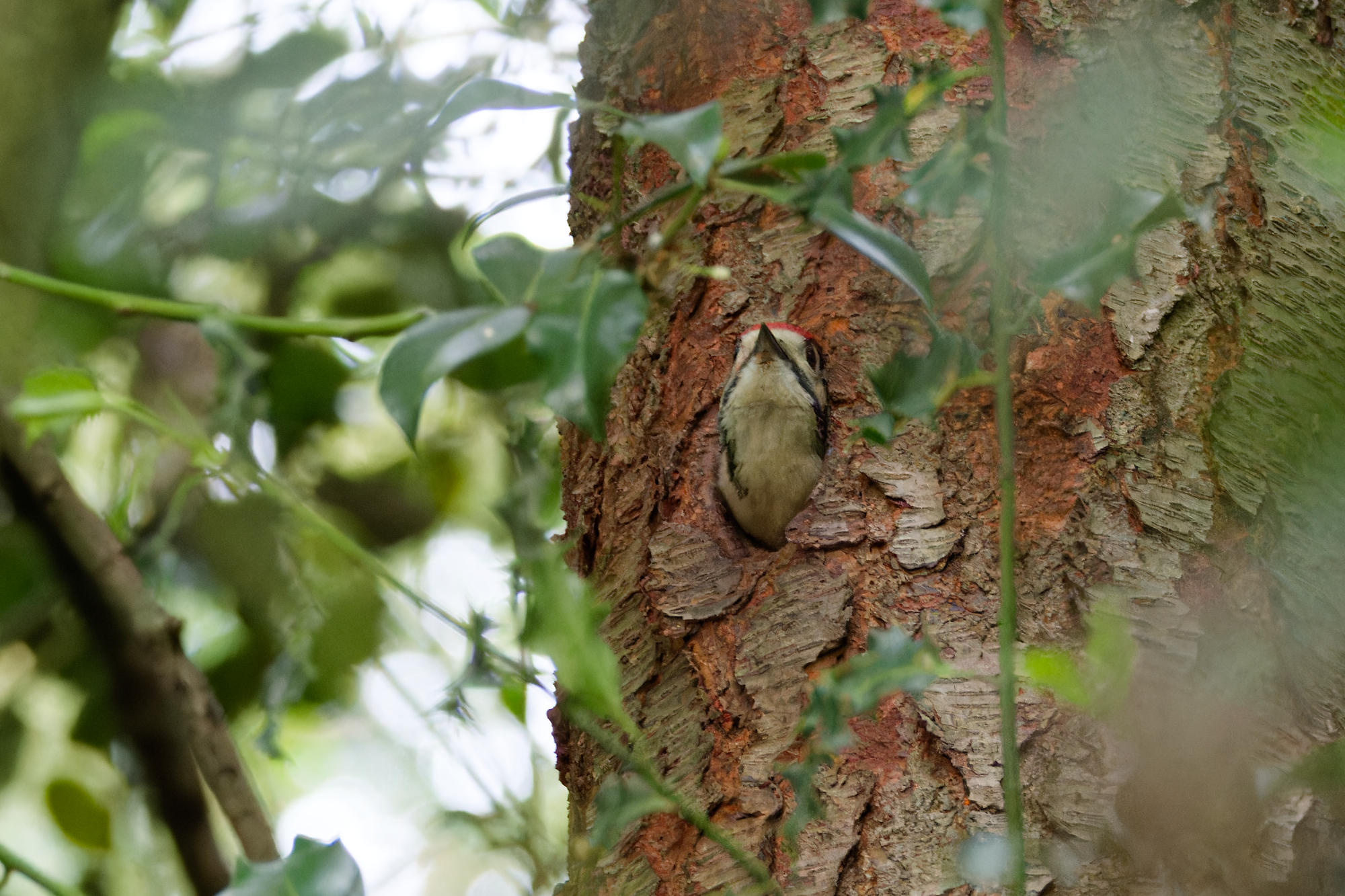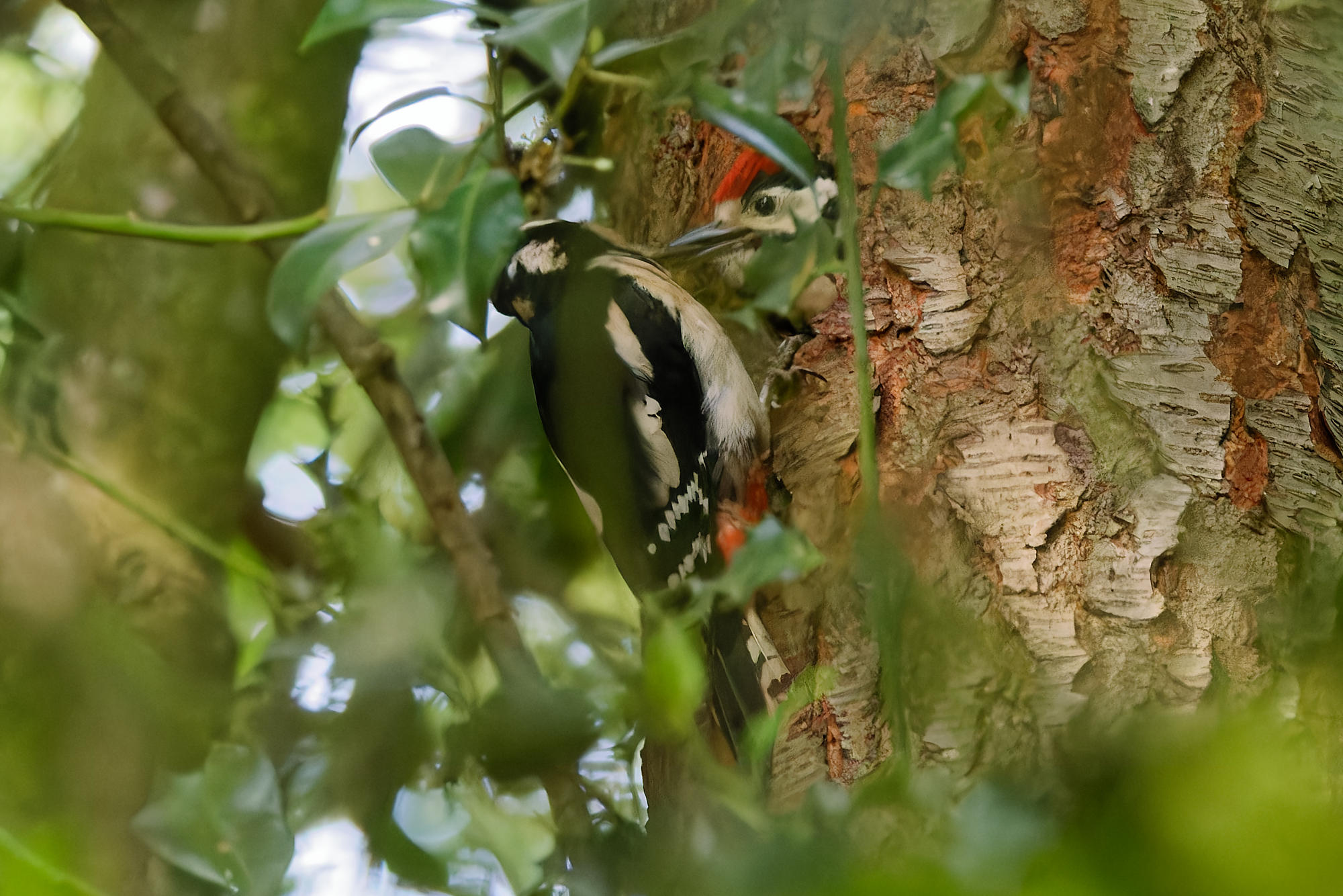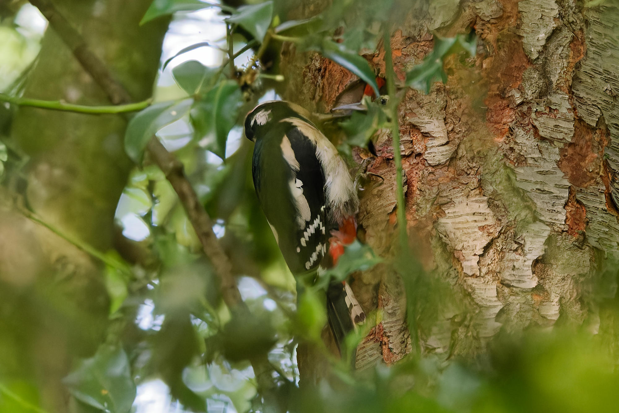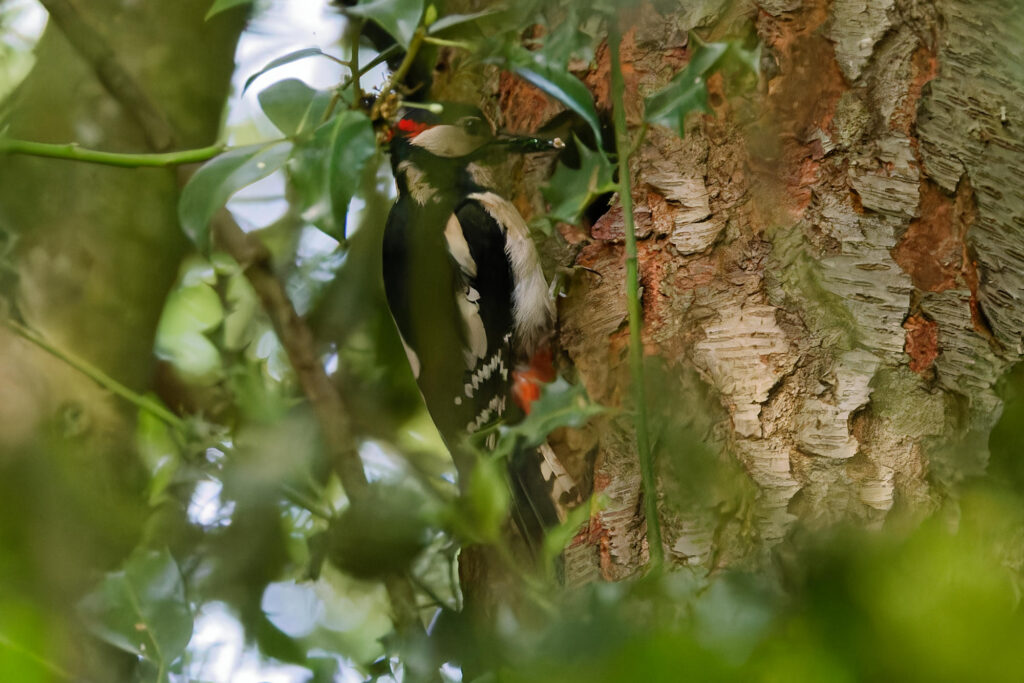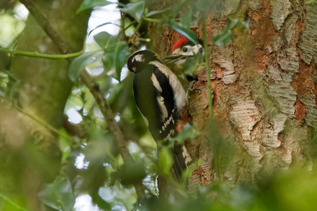 Et quand un jeune pic piaille, c’est qu’un adulte ne va pas tarder à passer, ici papa avec sa nuque rouge.