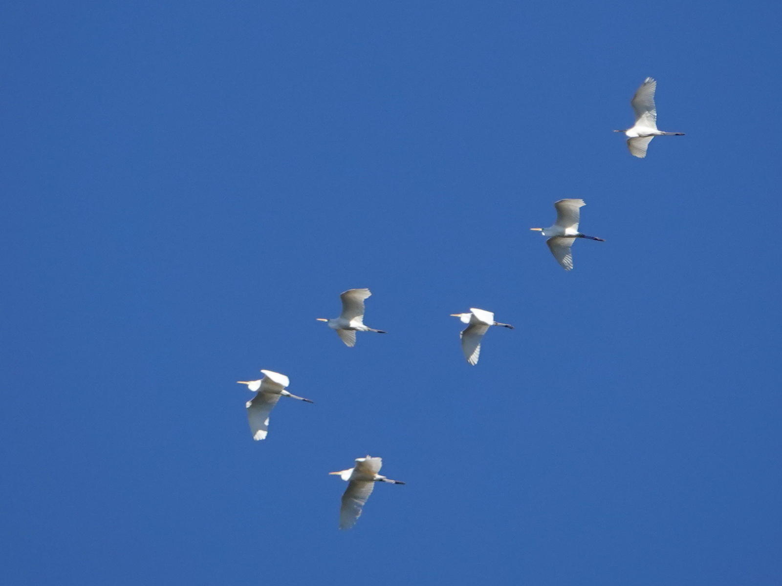 Cette escadrille de grandes aigrettes blanches semble poursuivie par un vilain petit canard tout noir, ou plutôt tout cendré…