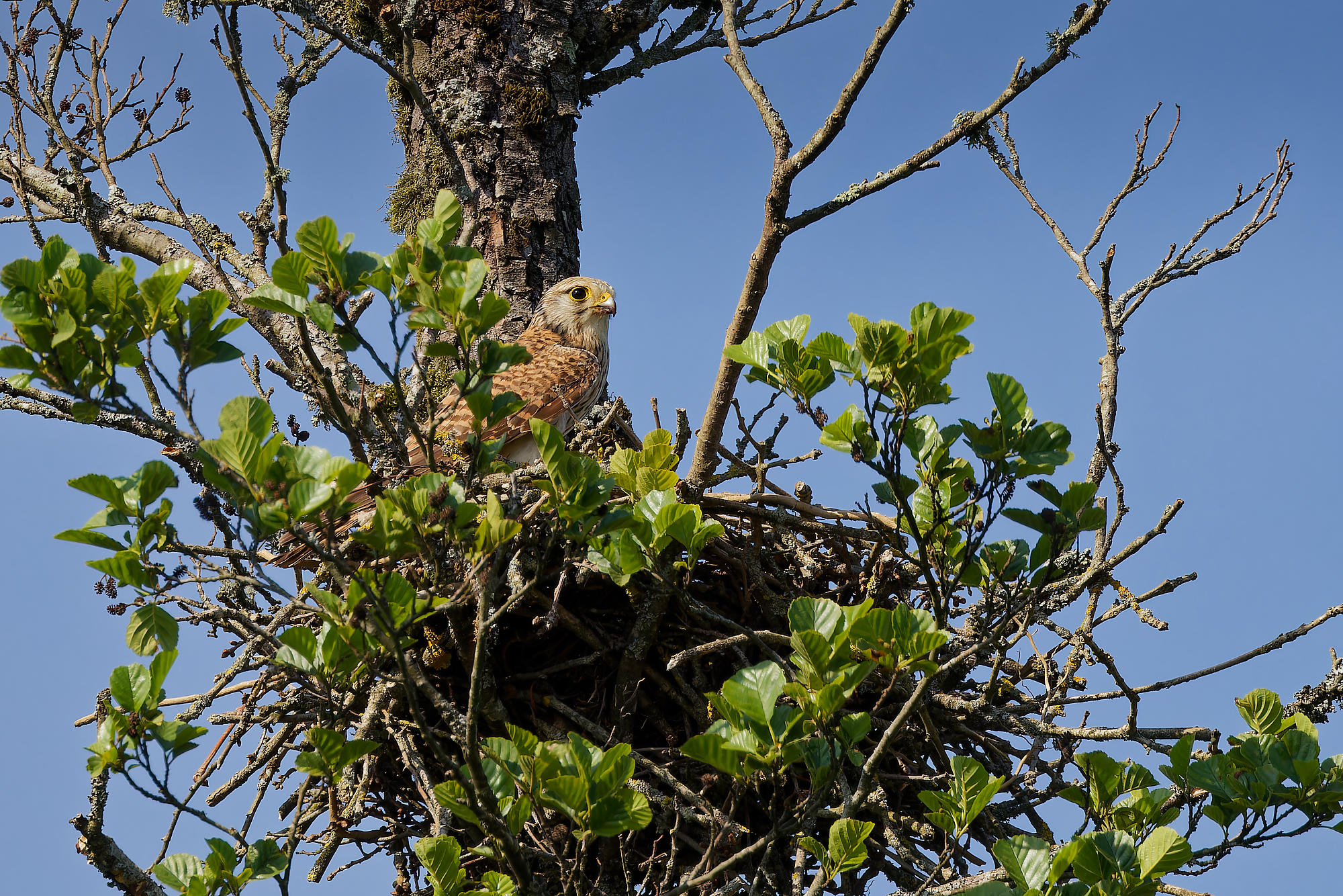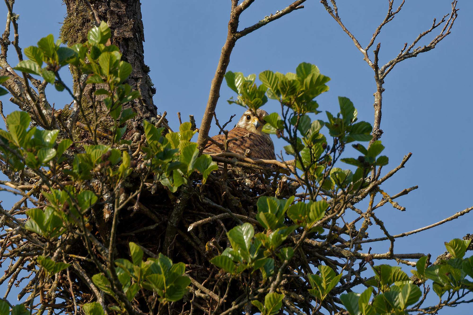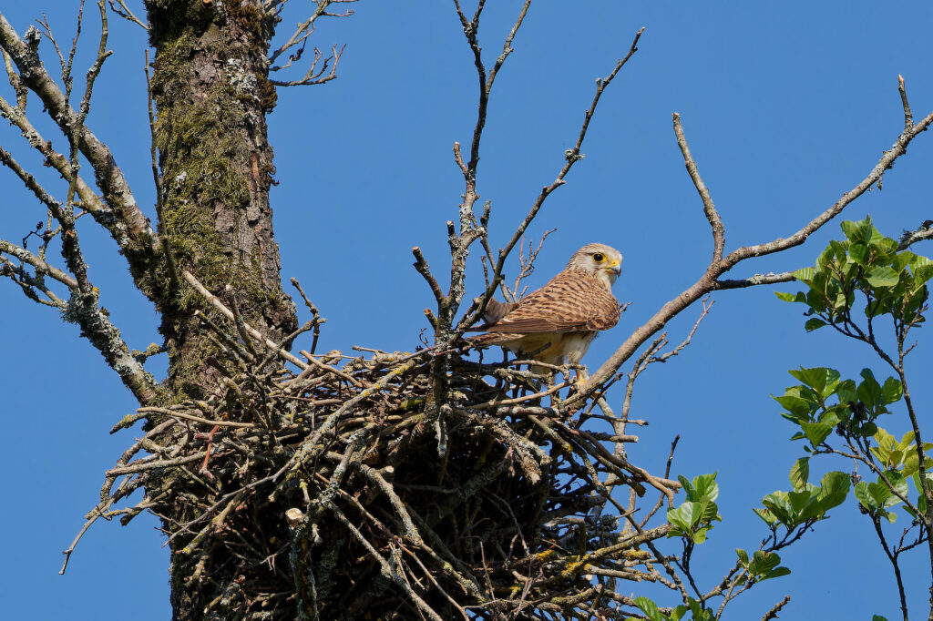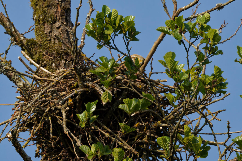 N’étant pas habitués à construire des nids arboricoles, ils réutilisent souvent des anciens nids de corvidés, comme celui-ci.