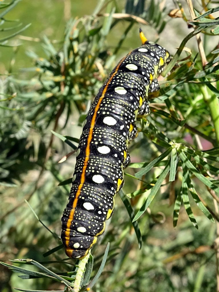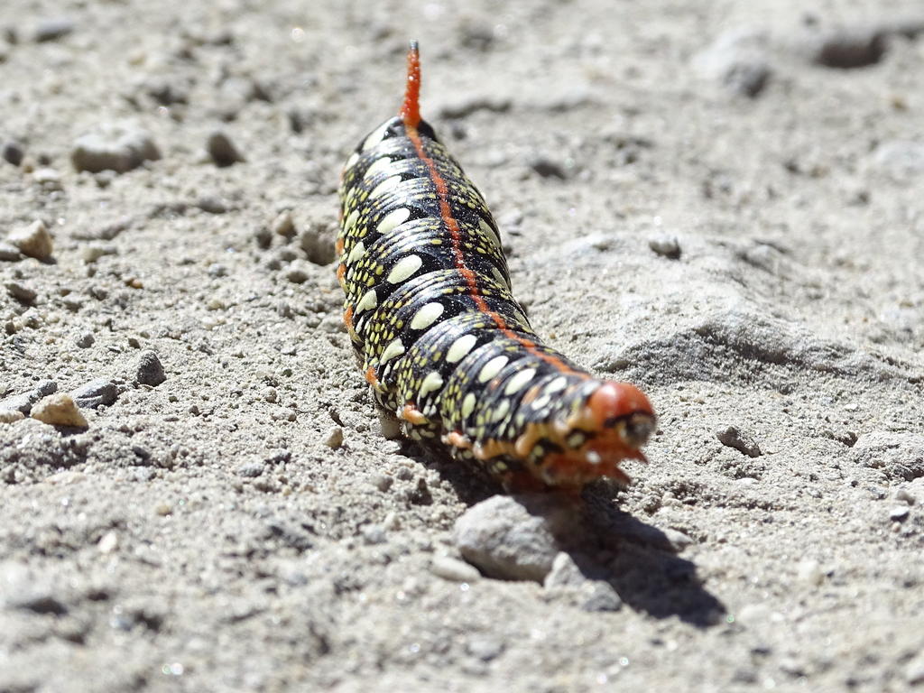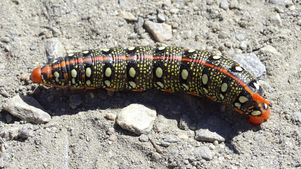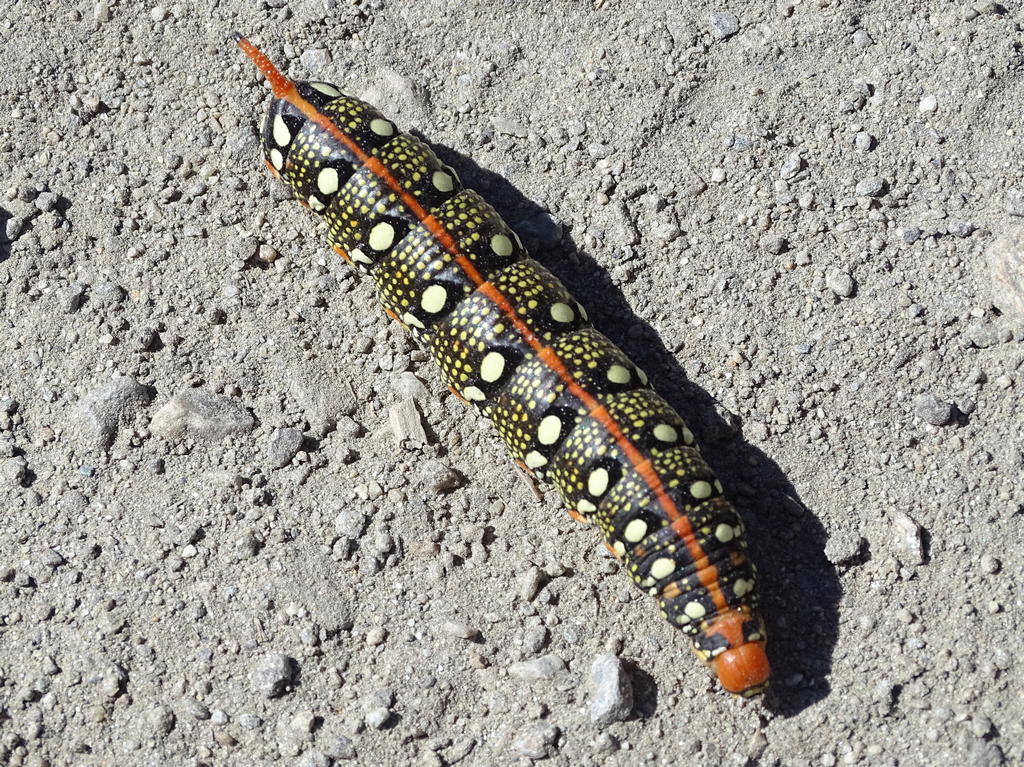 Et voici une chenille du Sphinx de l’euphorbe, en train de traverser le chemin ventre à terre.