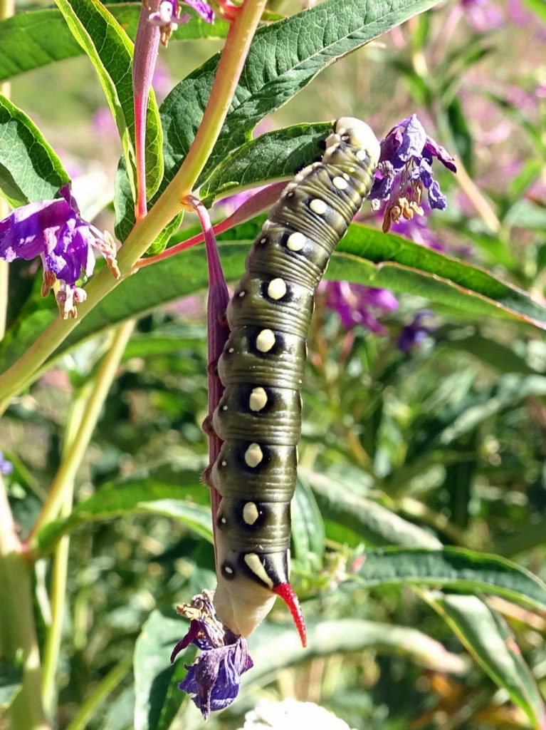 Ci-dessus une chenille de Sphinx du gaillet, en train de se régaler.