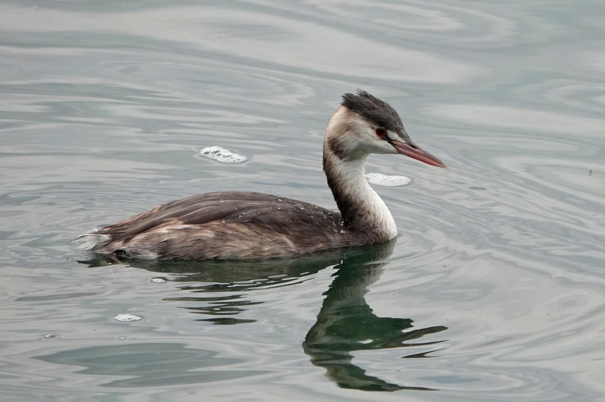Renseignement pris, il s’agit d’un grèbe huppé qui a enlevé son costume de noces, et notamment ses plumes rousses et noires qui ornent son cou au printemps, au moment où il est important de se faire beau !