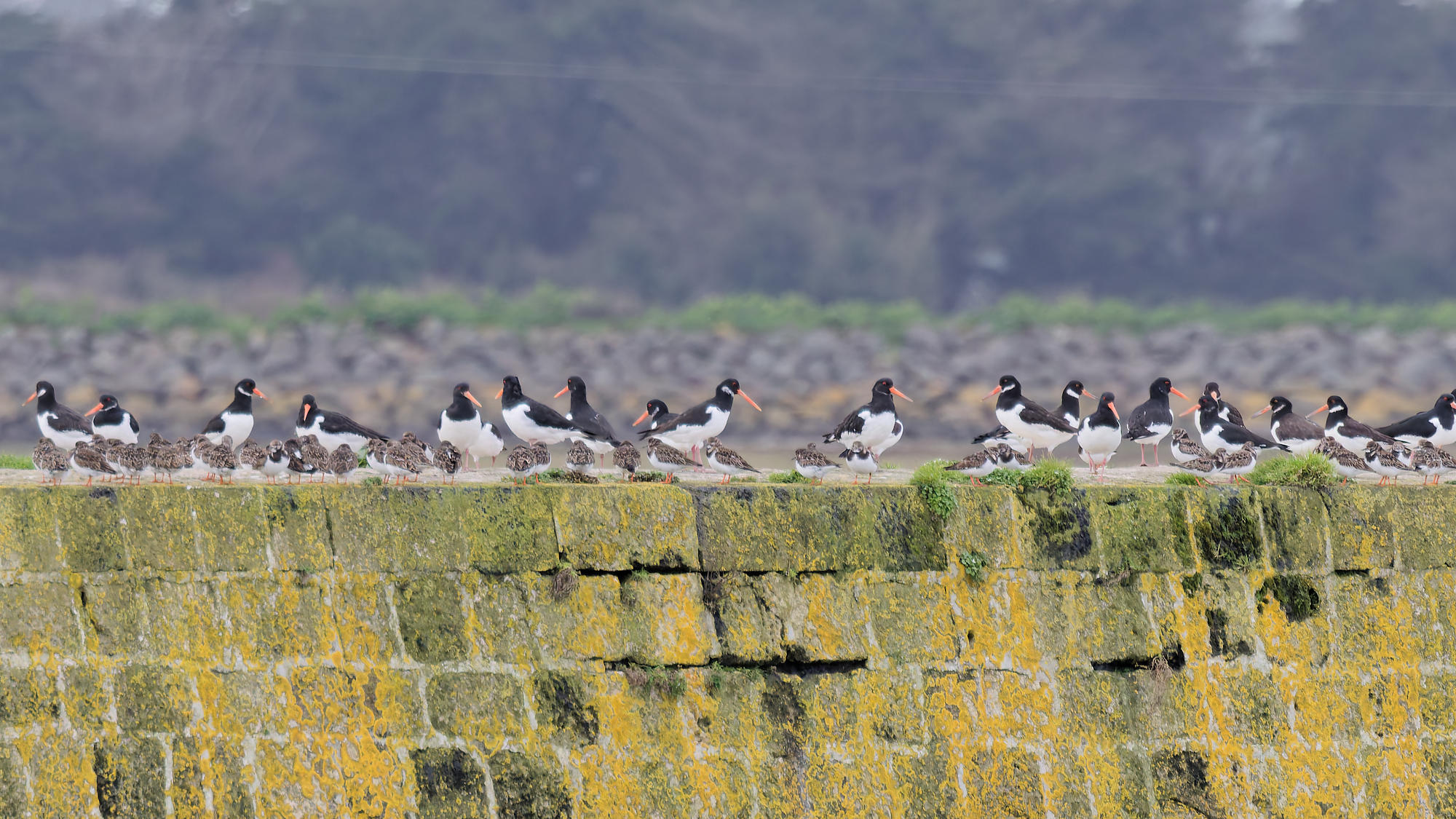 Discussions au sommet sur le rempart : les petits limicoles refusent de continuer à tourner les pierres, tandis que les becs rouges en costume pie monopolisent le haut du pavé.