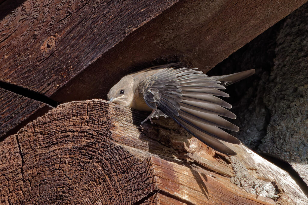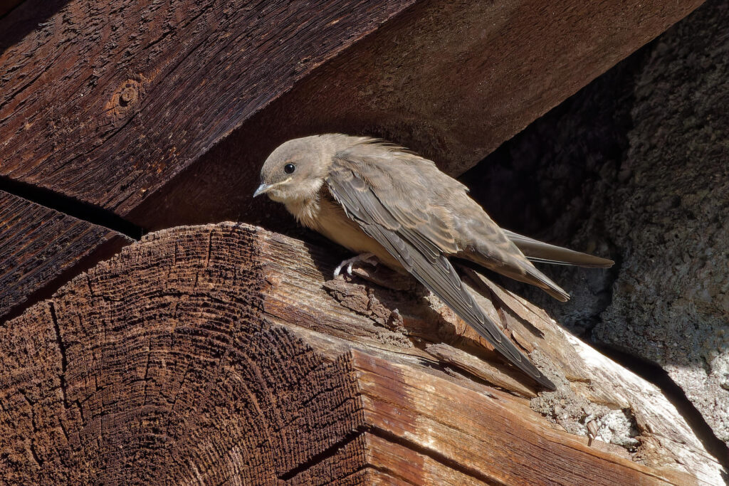 Une jeune hirondelle des rochers, avec son plumage brun,