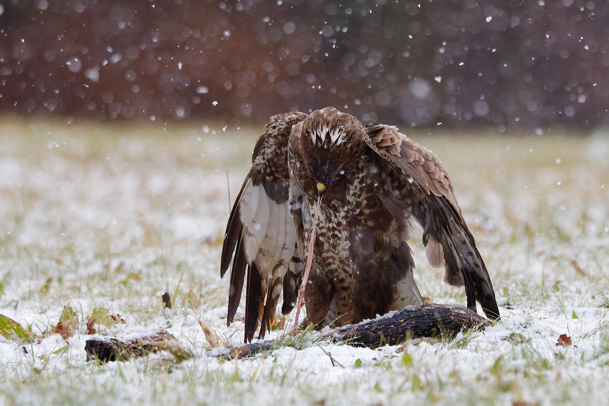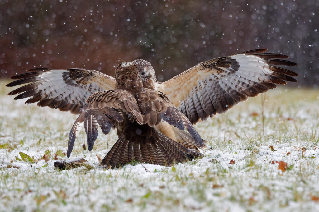 déployant ses ailes en manteau pour cacher son butin aux yeux d’autres prétendantes,