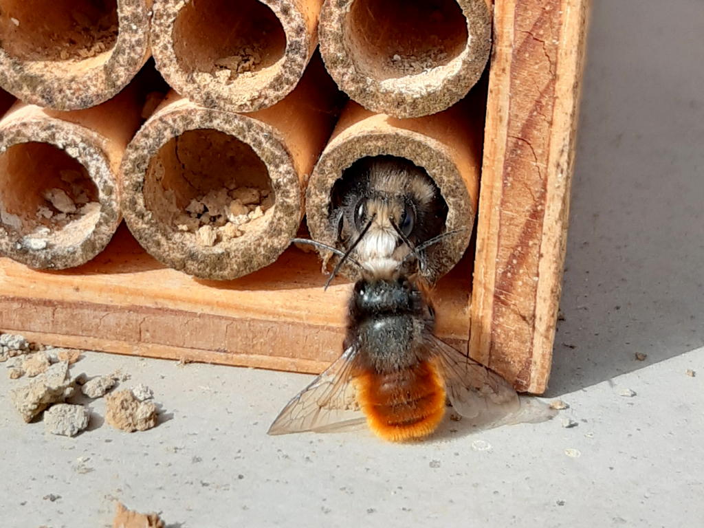 Le mâle est beaucoup plus spectaculaire, avec la tête complètement bleue, et le ventre et la poitrine orange.