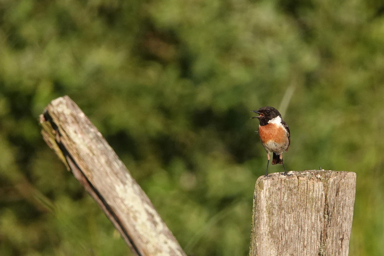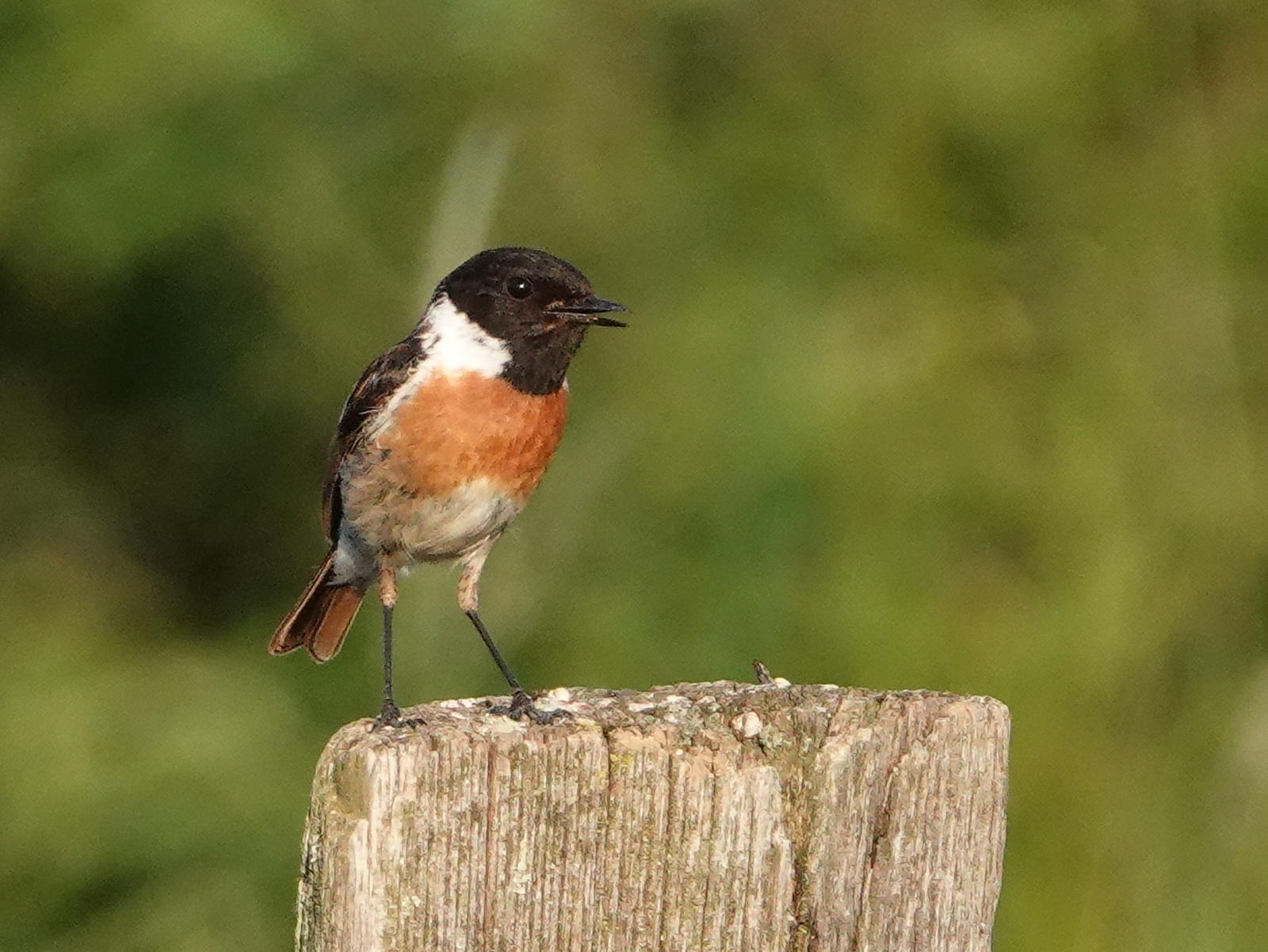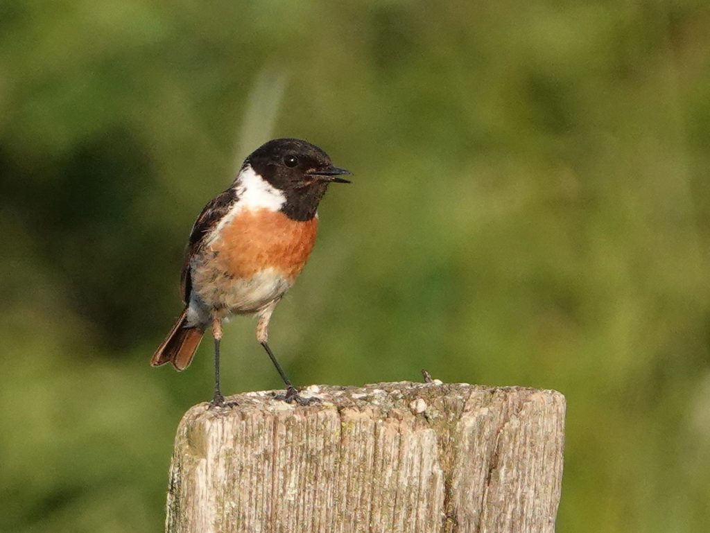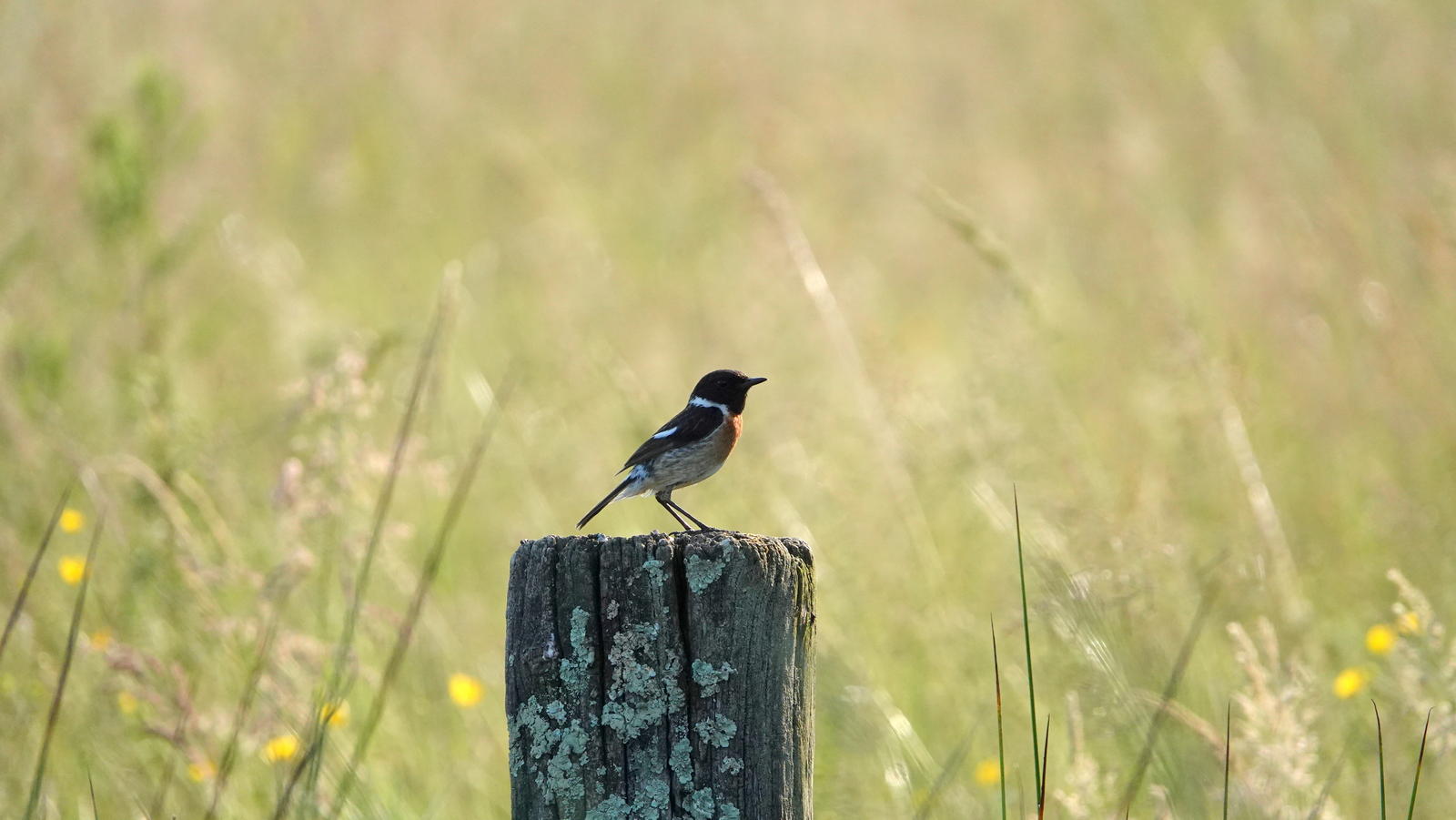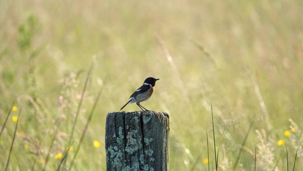 Ce beau tarier pâtre est bien installé sur son piquet en bordure de prairie ensoleillée.