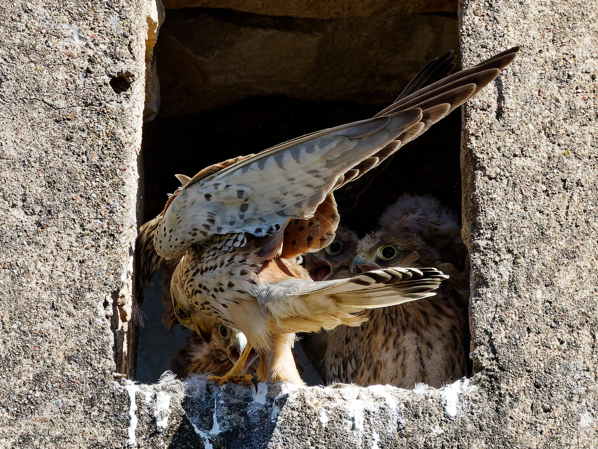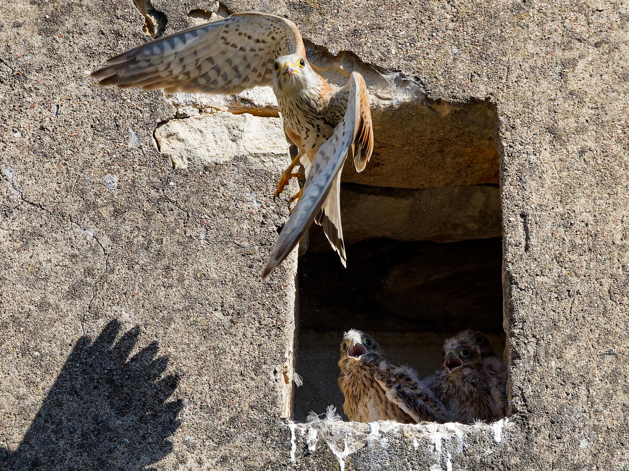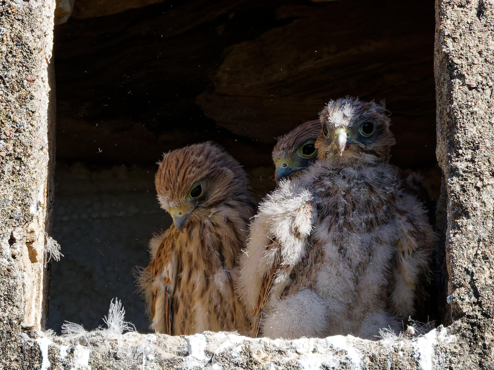 Cinq jeunes faucons grandissent dans une ouverture du mur qui borde la cour de Jacky, qui habite le village d’à côté.