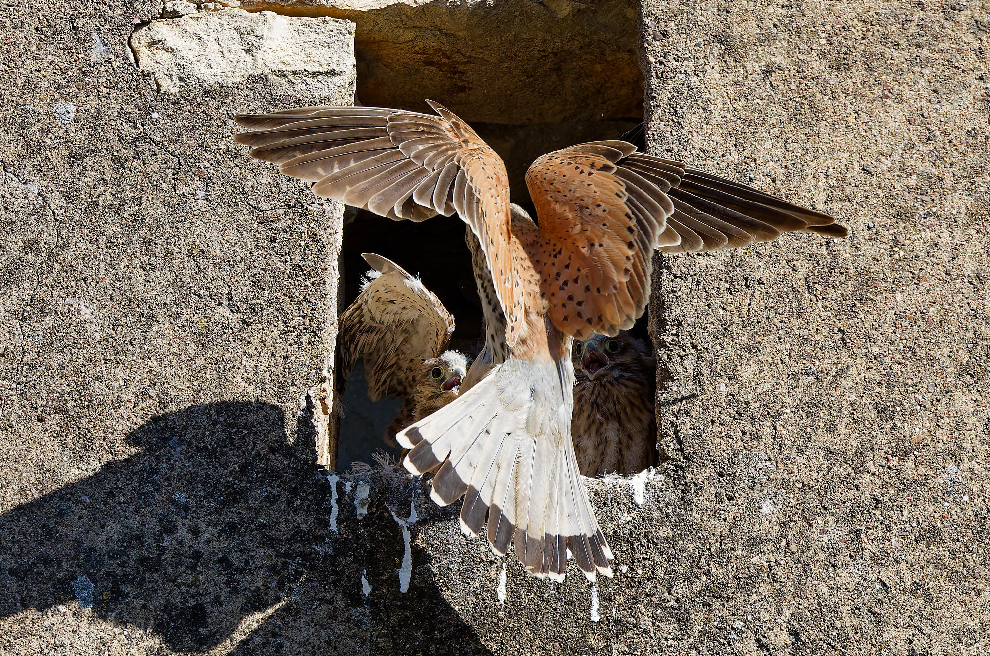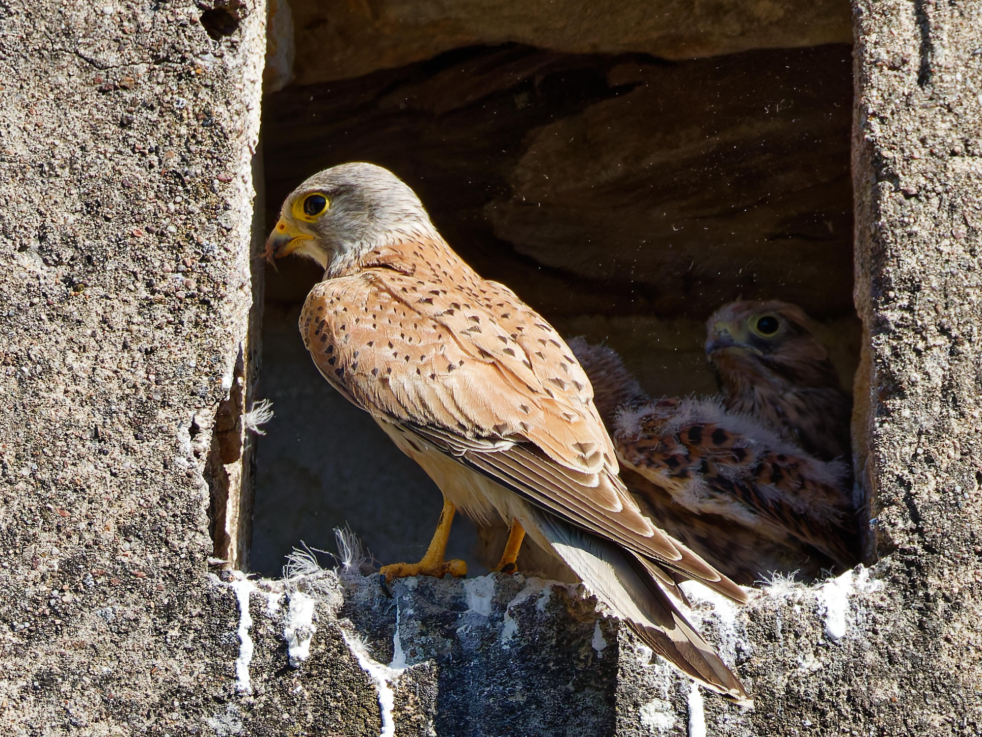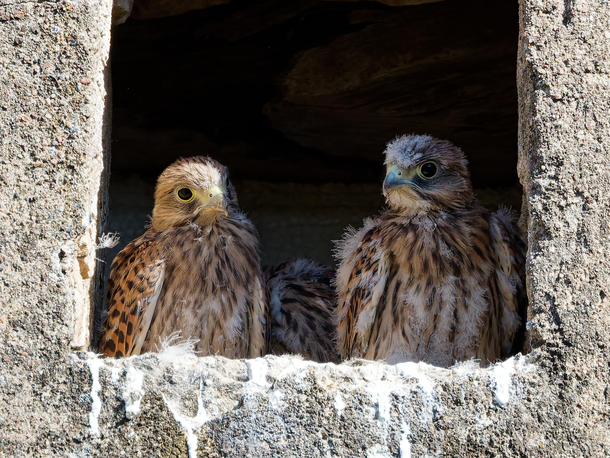 Cinq jeunes faucons grandissent dans une ouverture du mur qui borde la cour de Jacky, qui habite le village d’à côté.