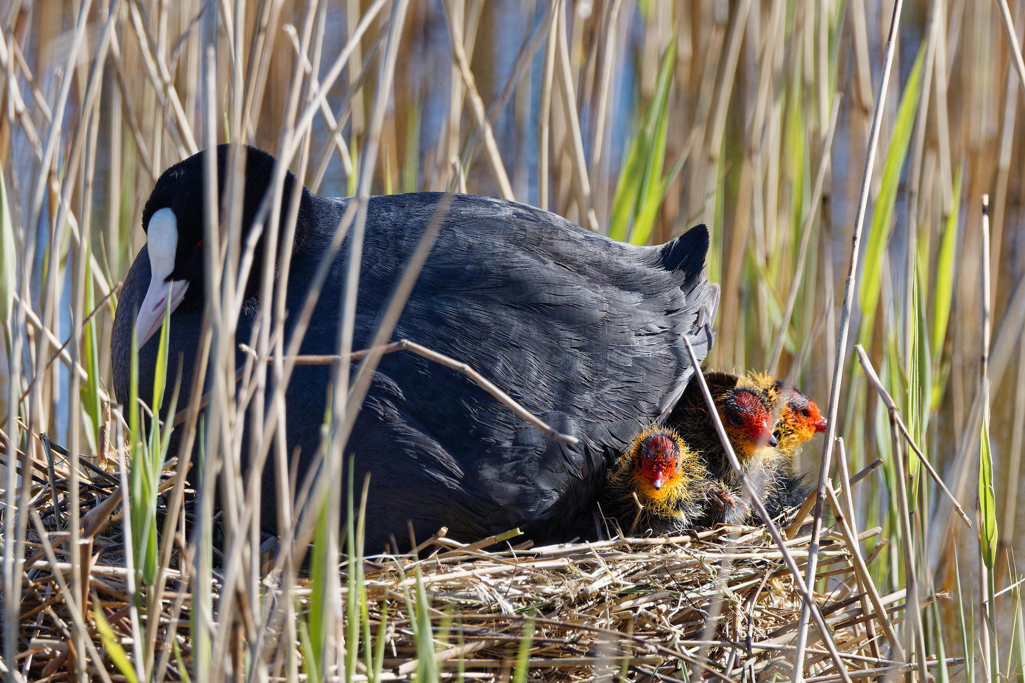 Quatre petites têtes rouges ont éclos dans ce nid, profitant de leurs premiers rayons de soleil,