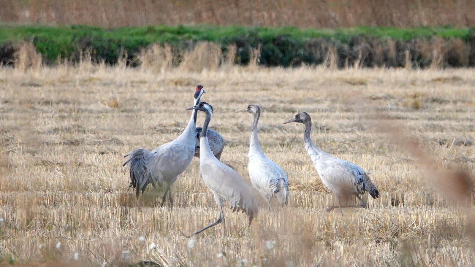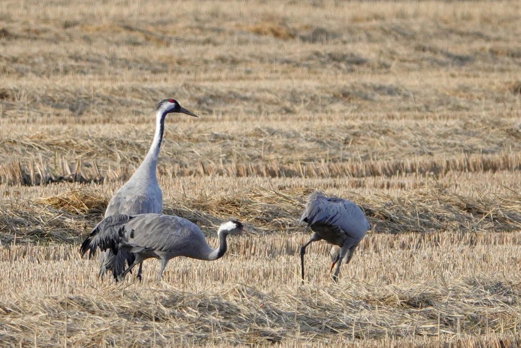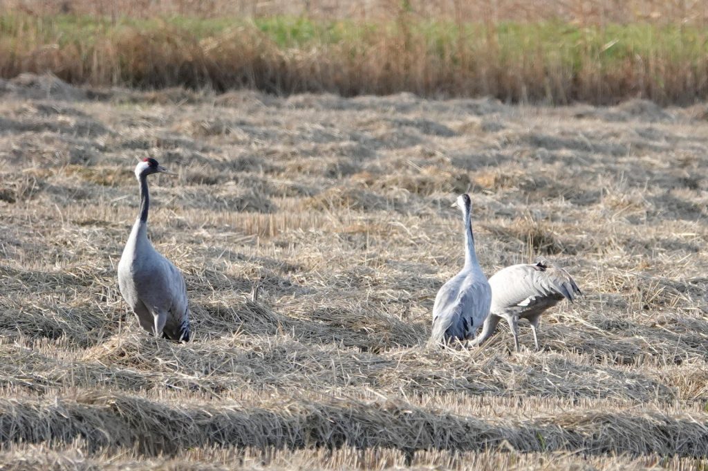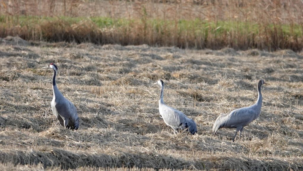 Les grues cendrées migrent en général du nord de l’Europe vers l’Afrique du nord et l’Espagne pour passer l’hiver. Un certain nombre s’arrête en France. Elles sont de plus en plus nombreuses à hiverner en Camargue, à l’instar de cette colonie qui occupait ces grands prés de chaumes à côté de notre gite.