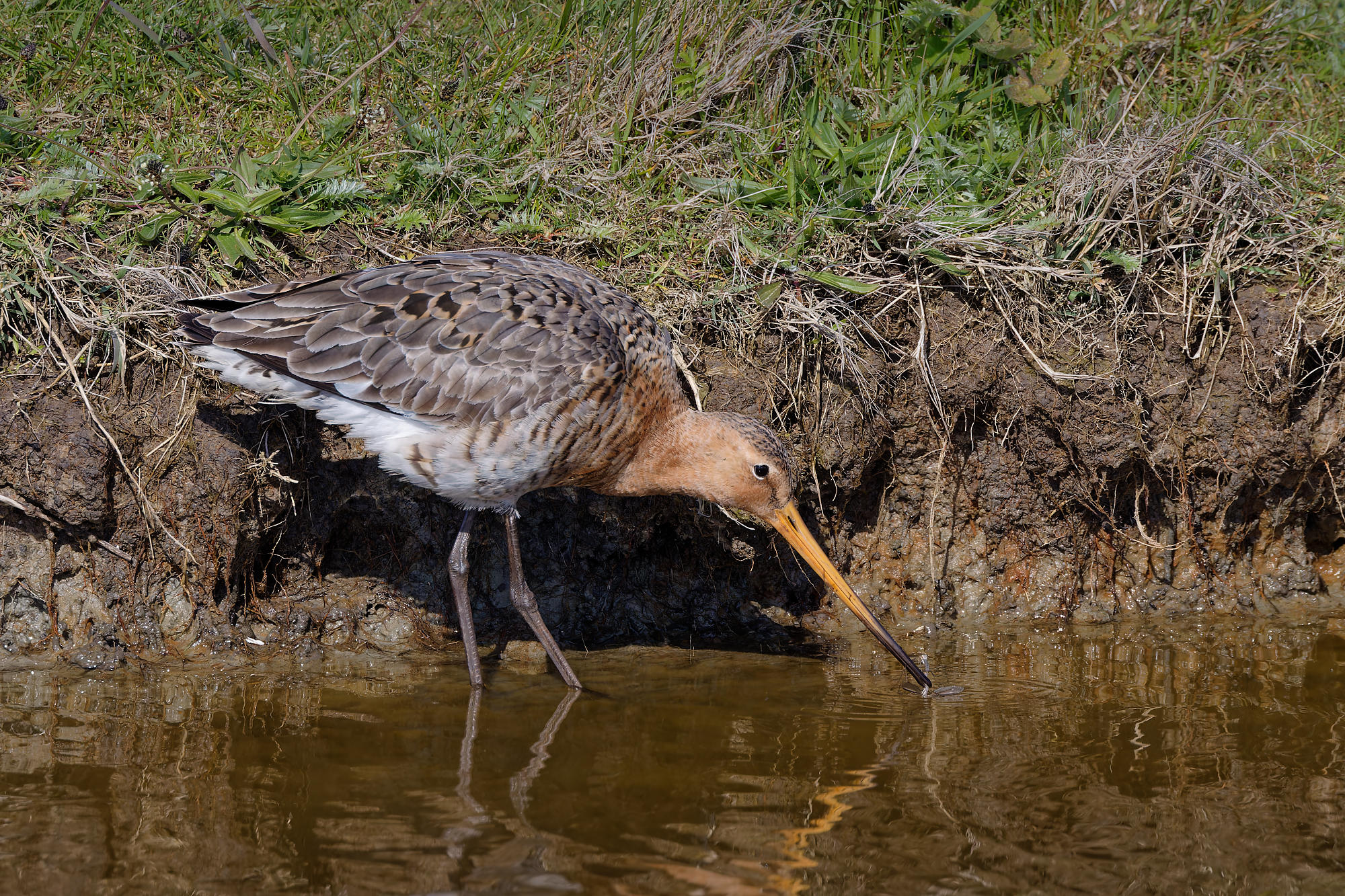 à sonder la vase avec leur long bec orange et noir légèrement incurvé vers le haut.
