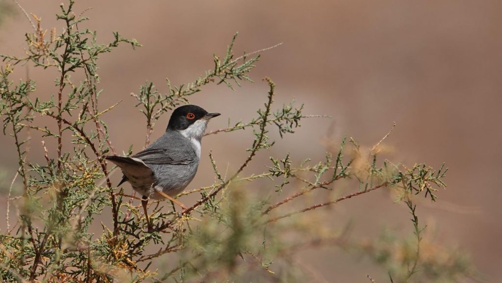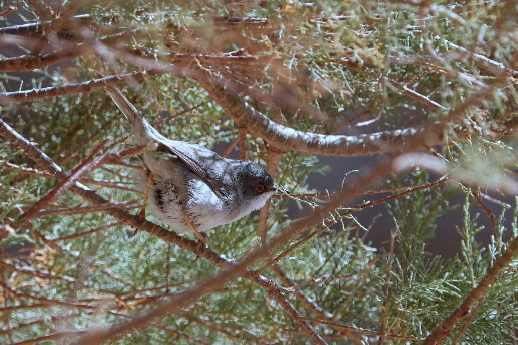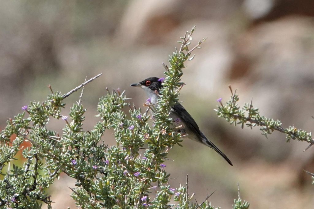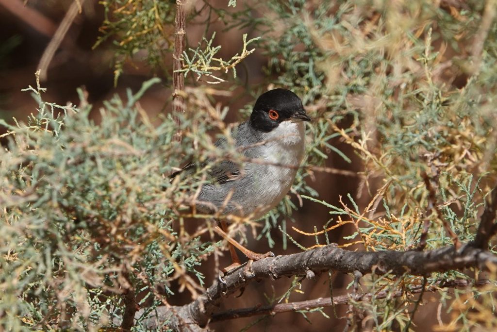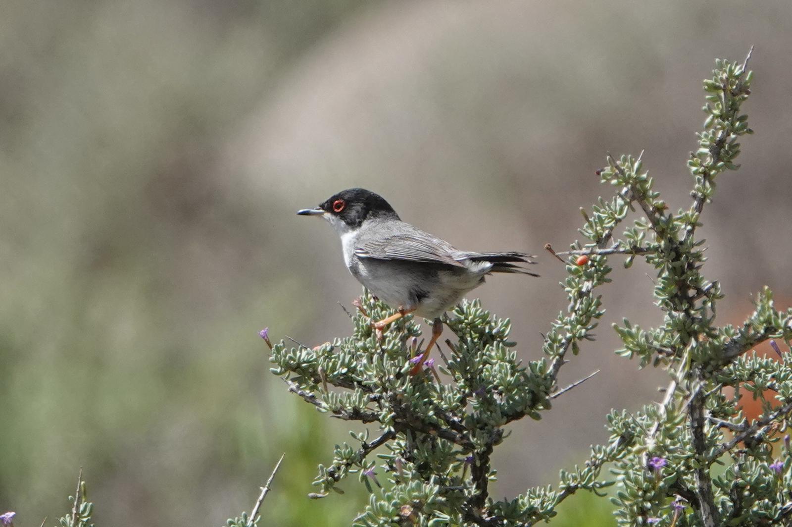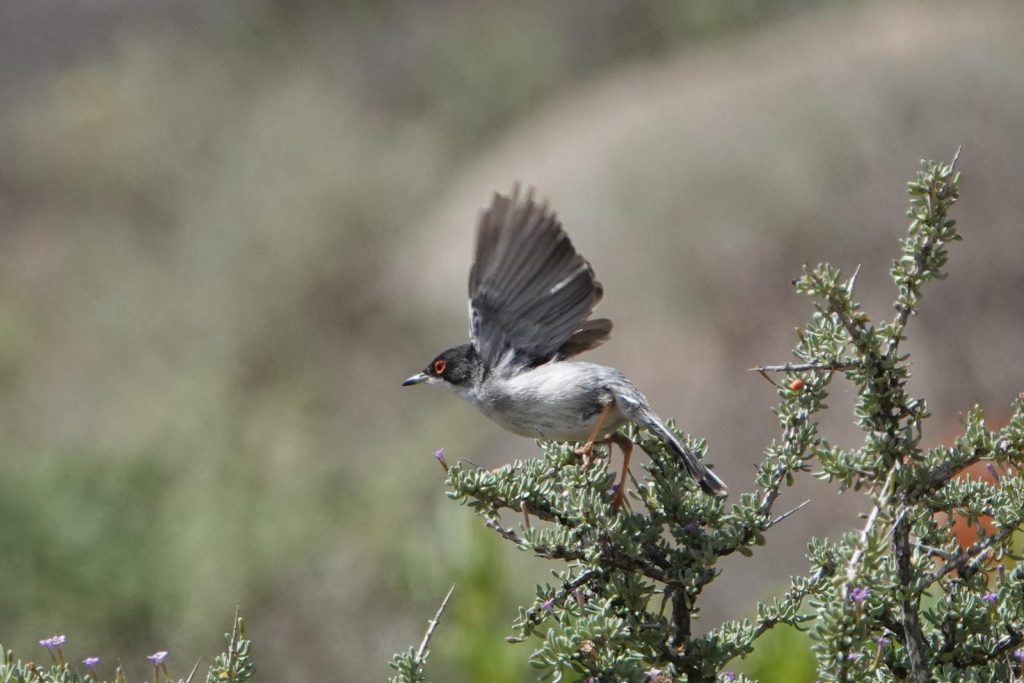 Qu’à cela ne tienne, on se met au grec ancien et je vous présente la fauvette mélanocéphale, qui se distingue aussi par ce magnifique œil ambré entouré de rouge.