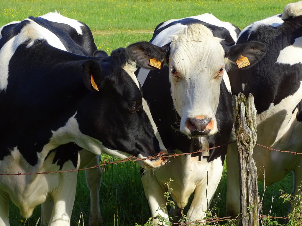 Des belles laitières en noir et blanc profitent des pâturages et du soleil de fin de journée.