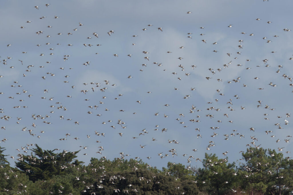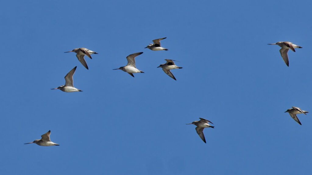 Des centaines de barges à queue noire qui volent de concert, à la recherche du marais idéal,
