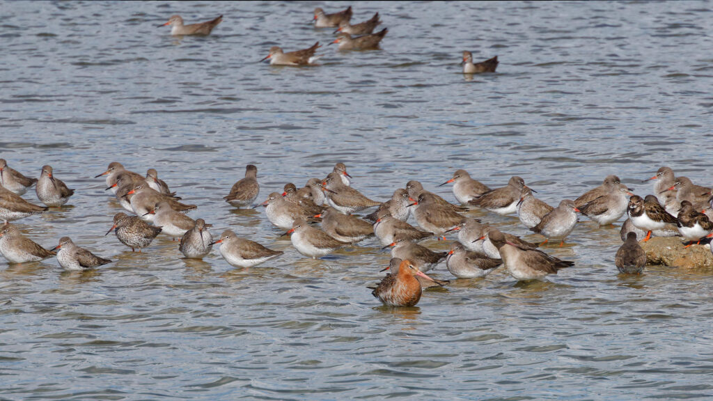 Une barge rousse plus rousse, en avance sur le printemps, perdue parmi les chevaliers,