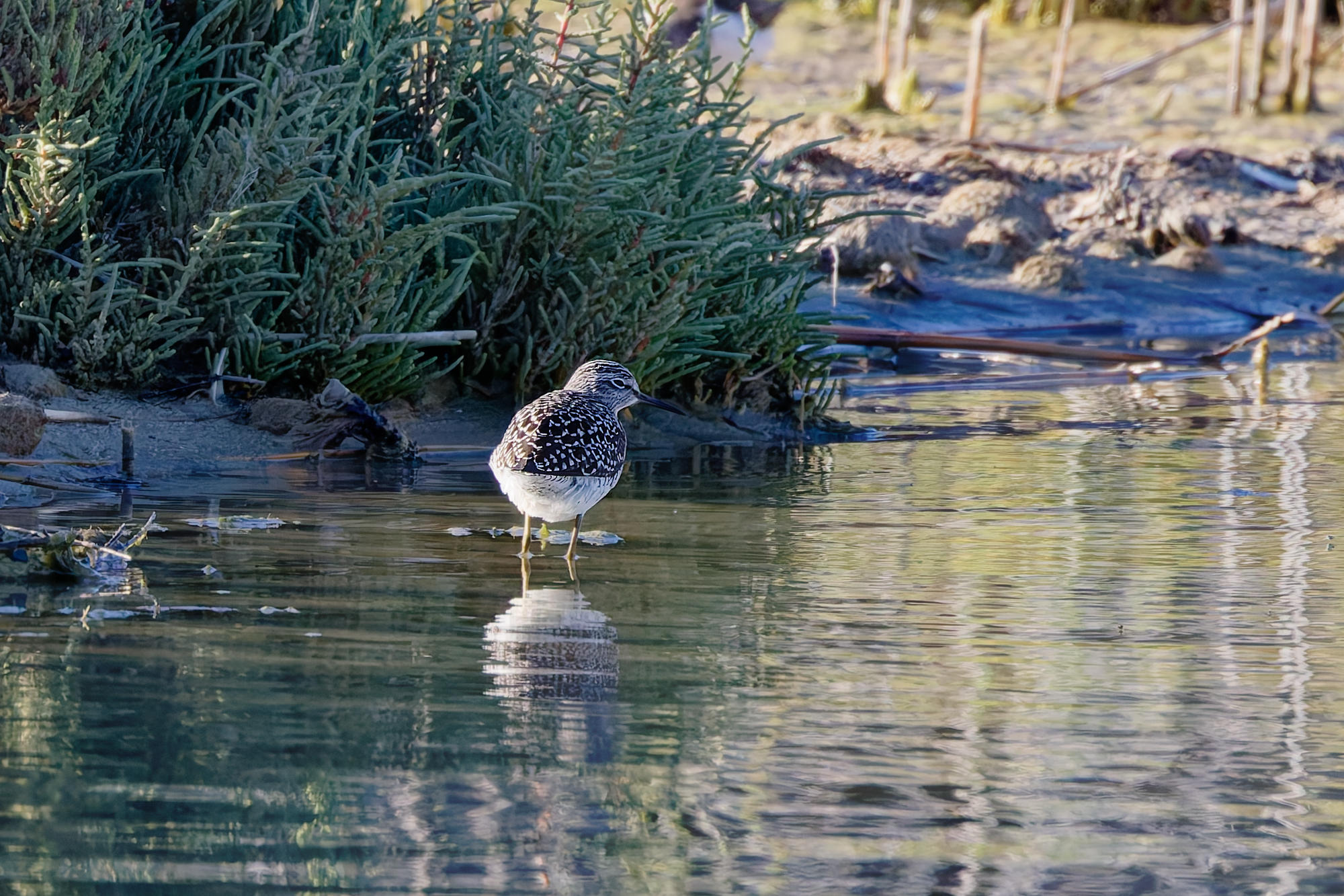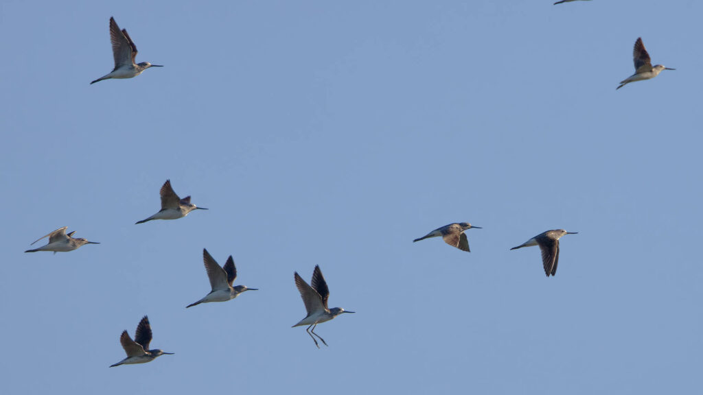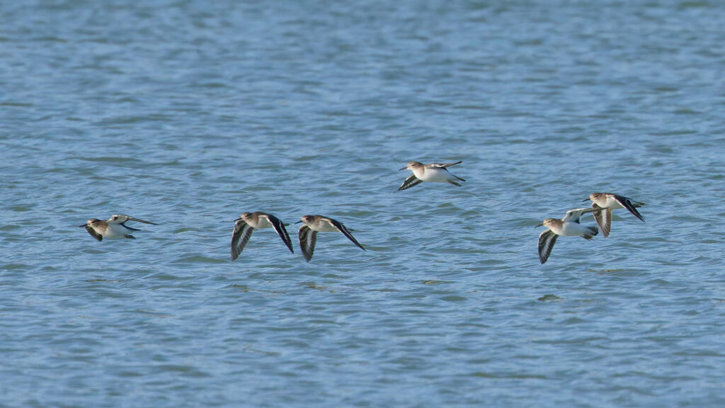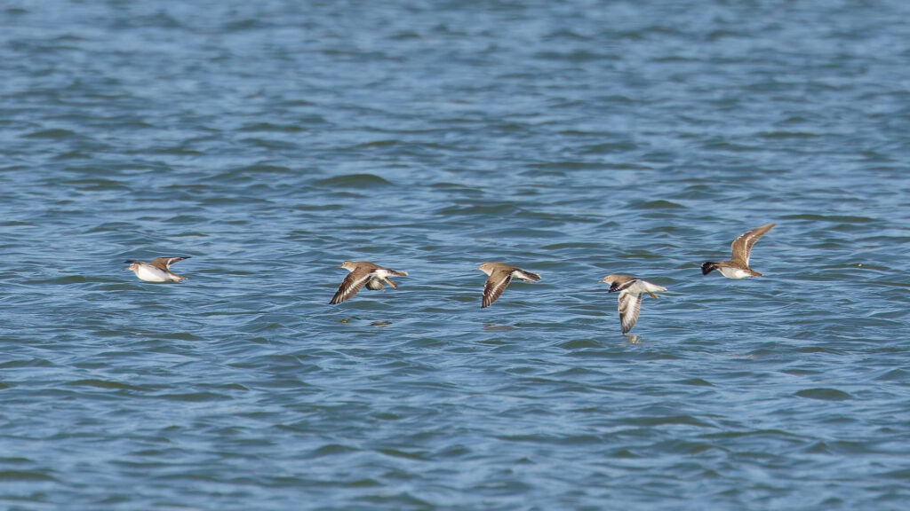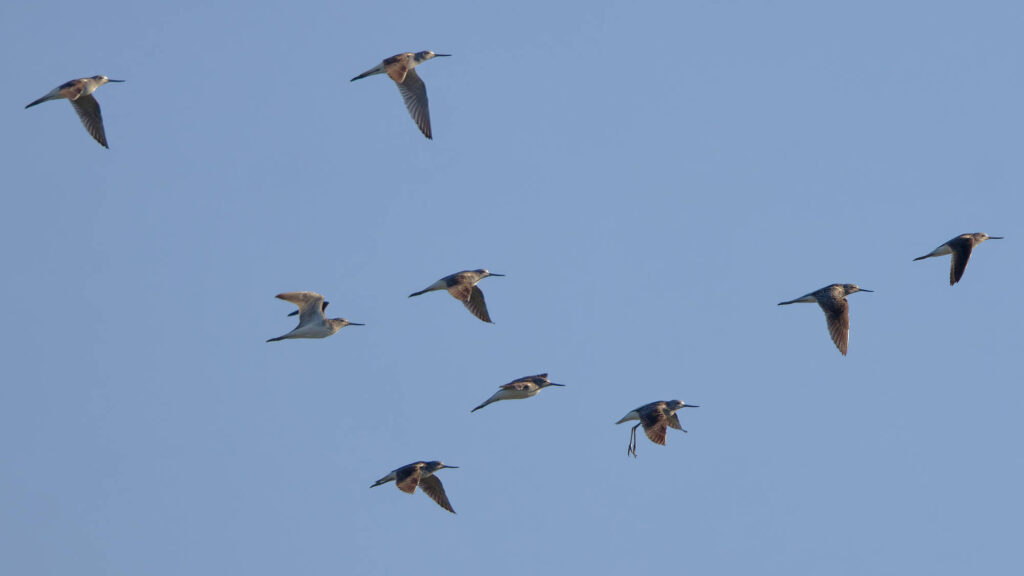 Tout en haut des bécasseaux sanderling, que nous connaissons déjà bien dans la Gazouillette, et ci-dessus un chevalier sylvain, déjà vu une seule fois il y a quatre ans pas loin du village.