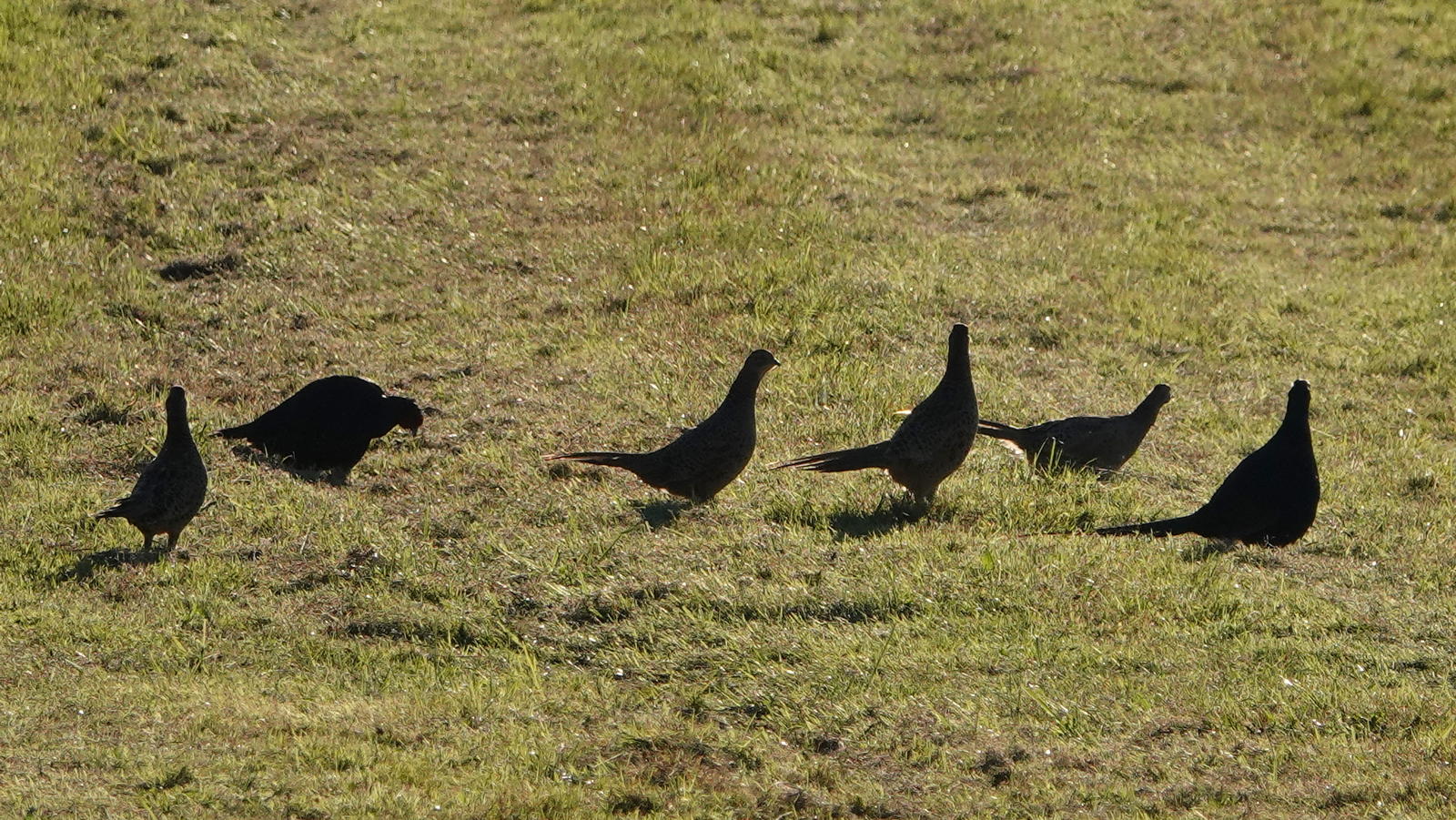 À première vue, dans ce pré à la fin de journée, six silhouettes toutes noires de de faisans à contrejour.