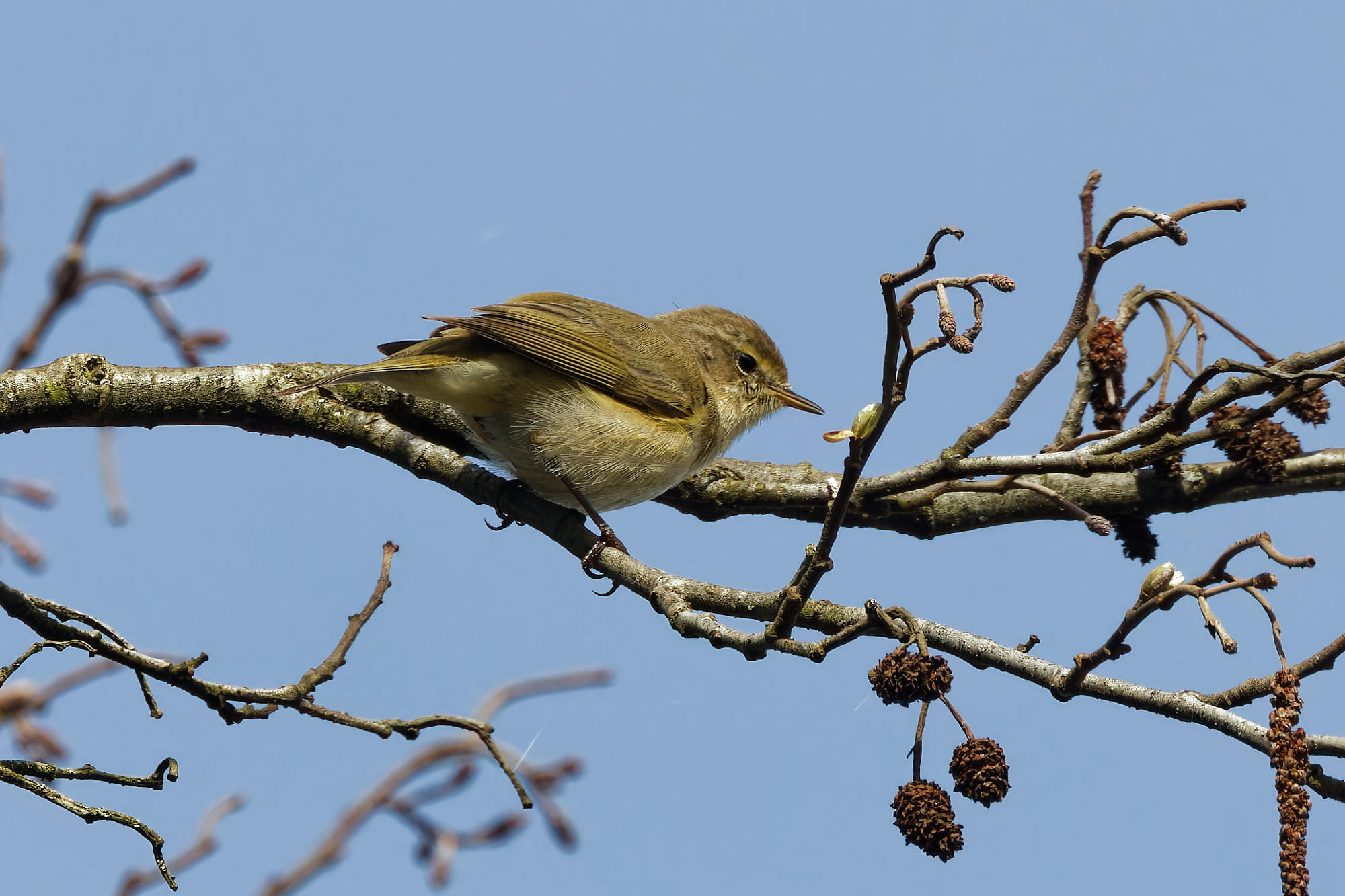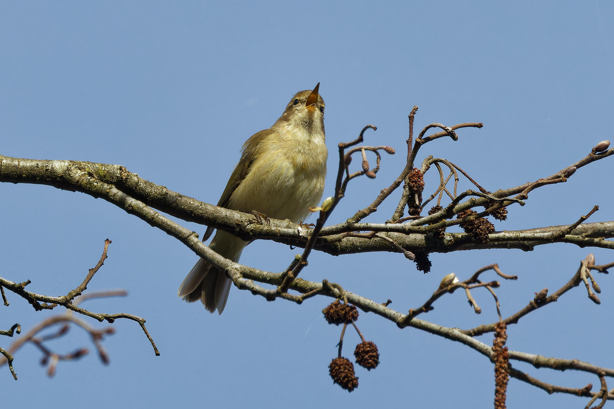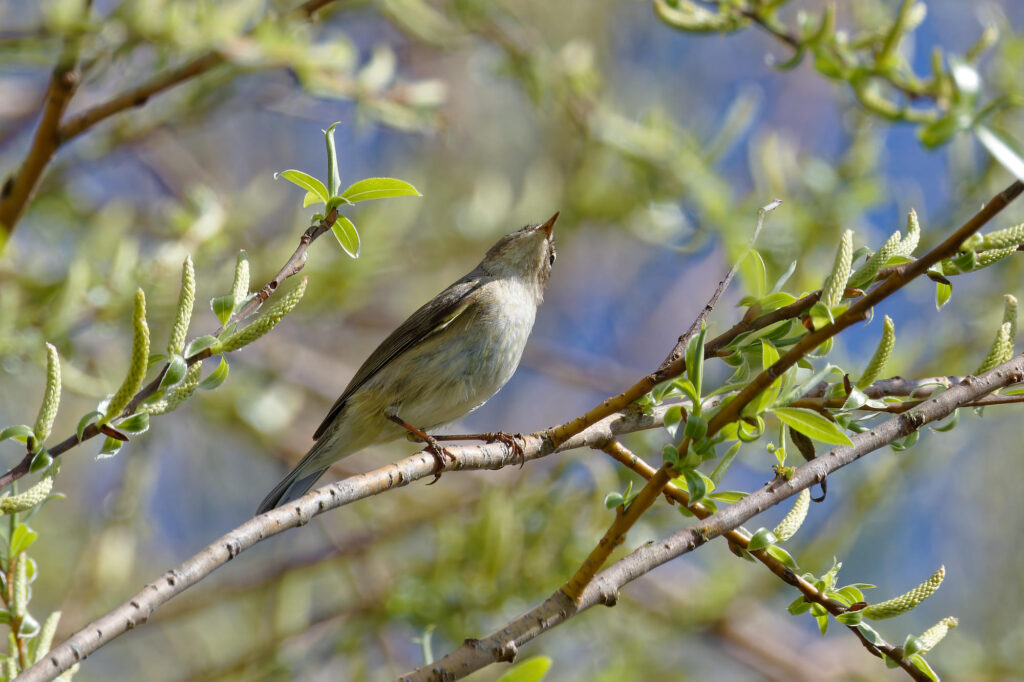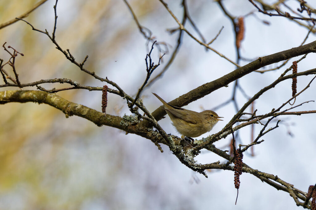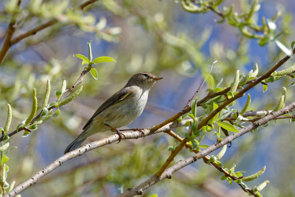 Les arbres commencent à reverdir, et le Pouillot véloce compte parmi les premiers à suivre ce mouvement annonciateur du retour des insectes dont il se nourrit.