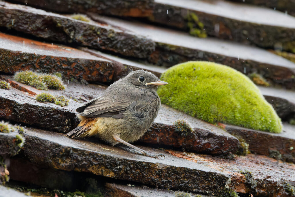 pour accompagner et protéger l’envol de sa nichée sous l’avant-toit.