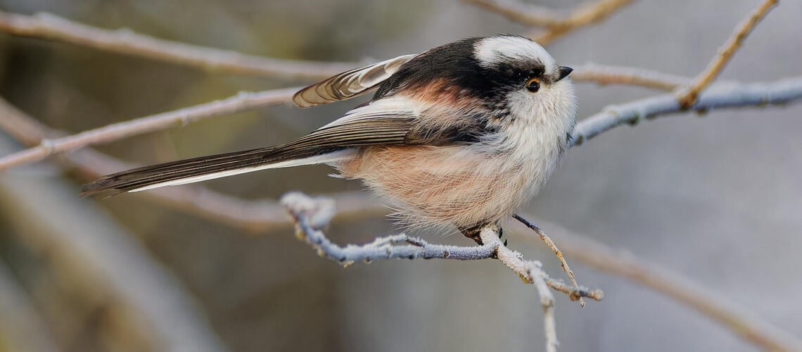 Après le Rouge-gorge, c’est au tour de la Mésange à longue queue de se transformer en pompon pour résister au matin givré, appréciant les premiers rayons du soleil.