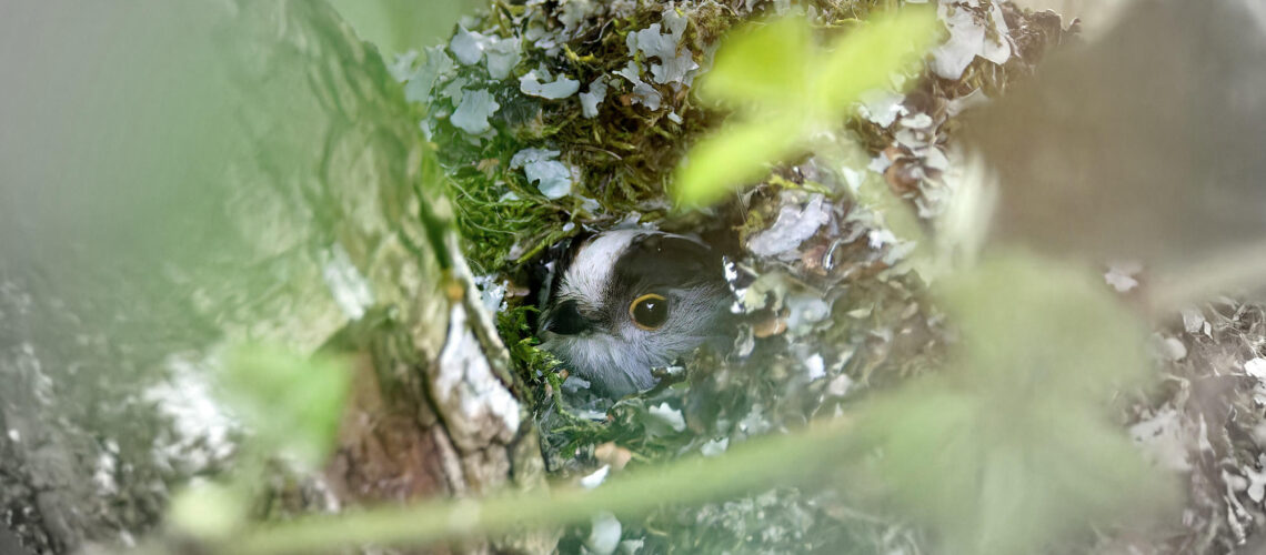 Quelques nouvelles des mésanges à longue queue qui couvent encore. On peut parfois, avec un peu d’aide du vent, apercevoir l’œil de l’adulte bien caché dans le nid de mousse et de plume.