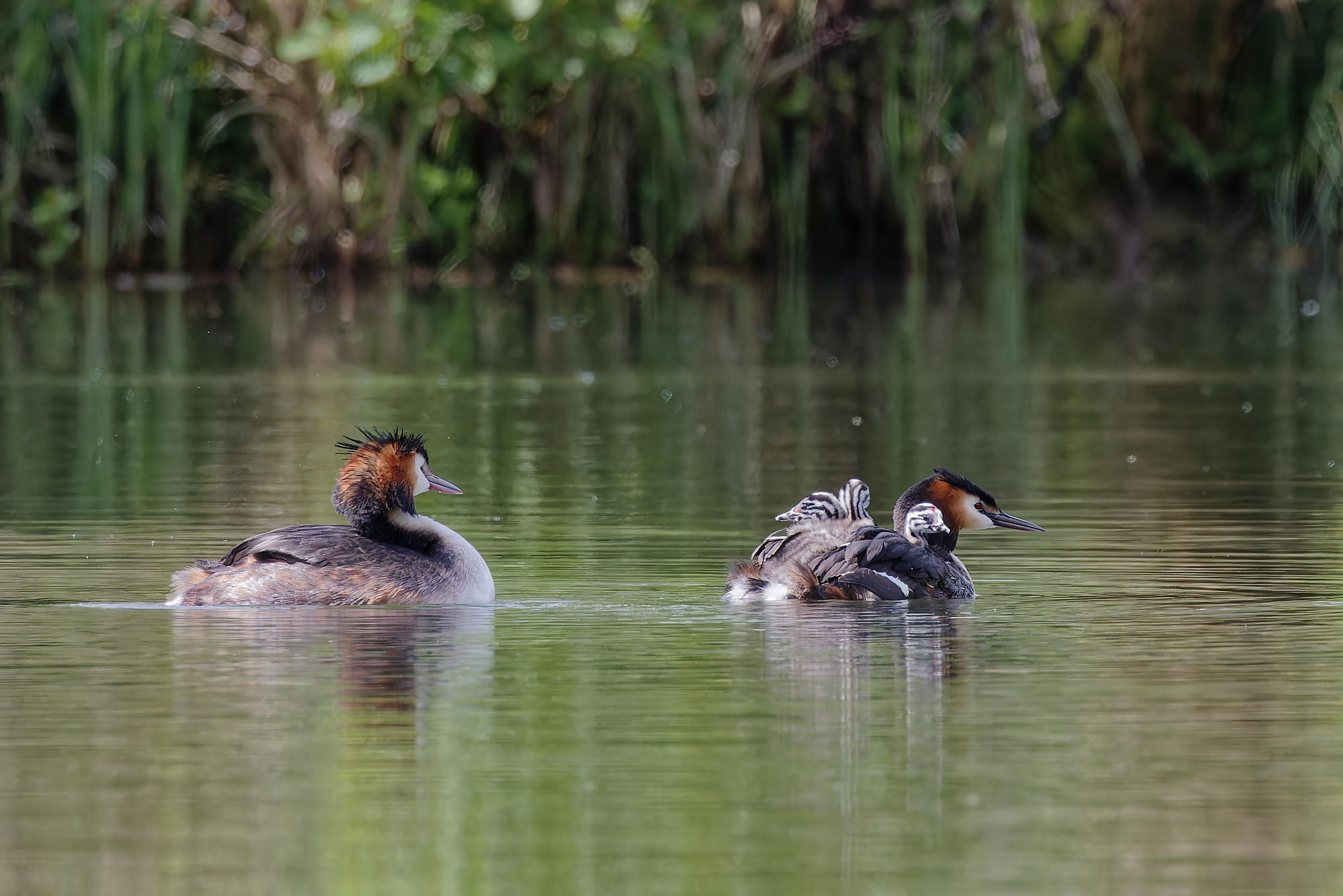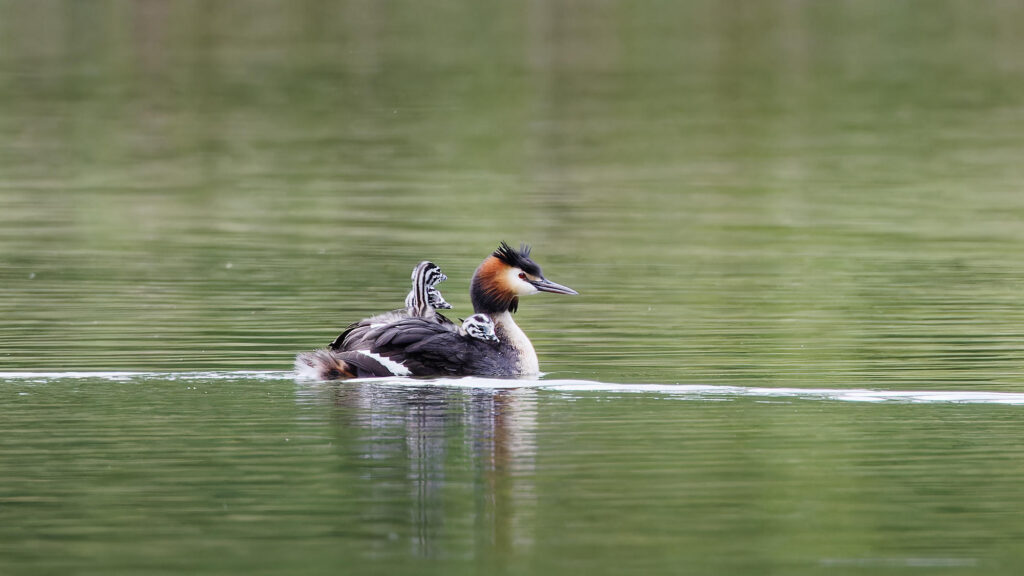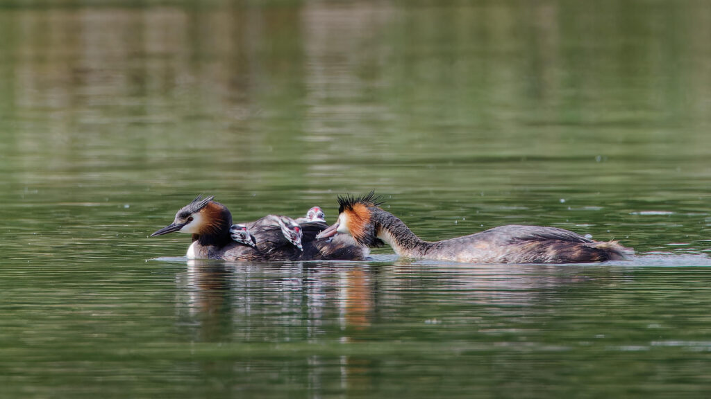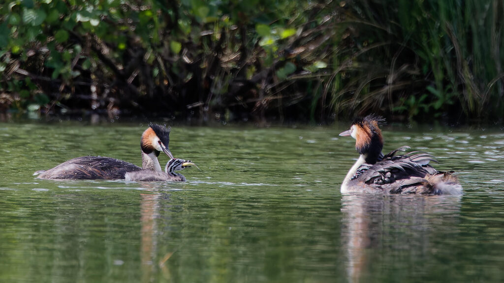 Ce sont finalement trois petits grèbes qui naviguent sur l’étang sur le dos de leurs parents.