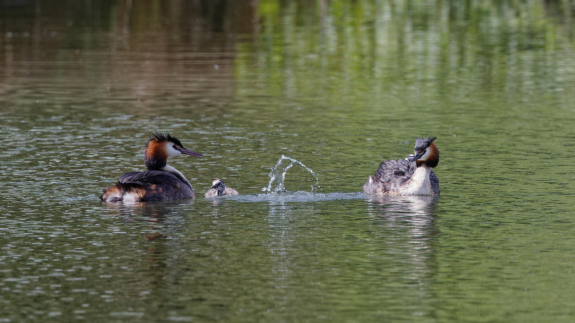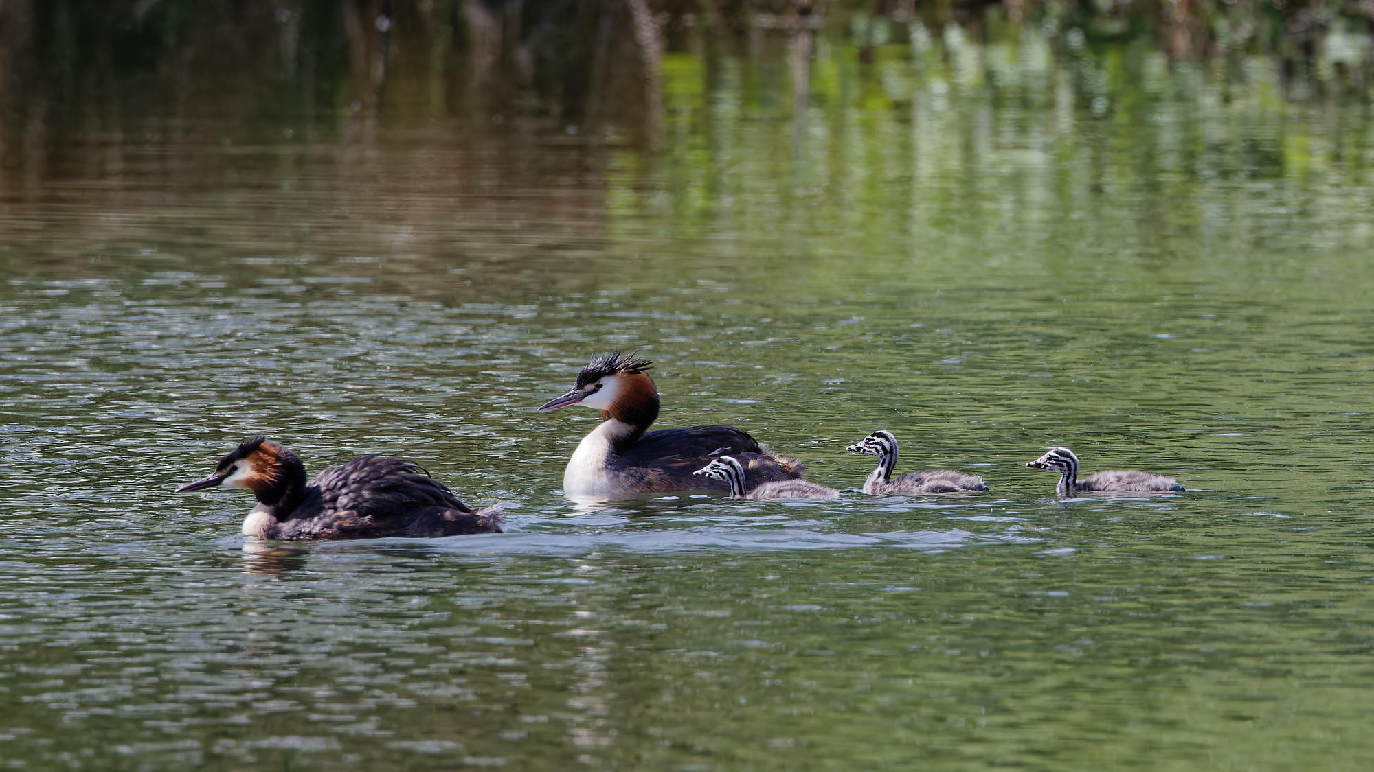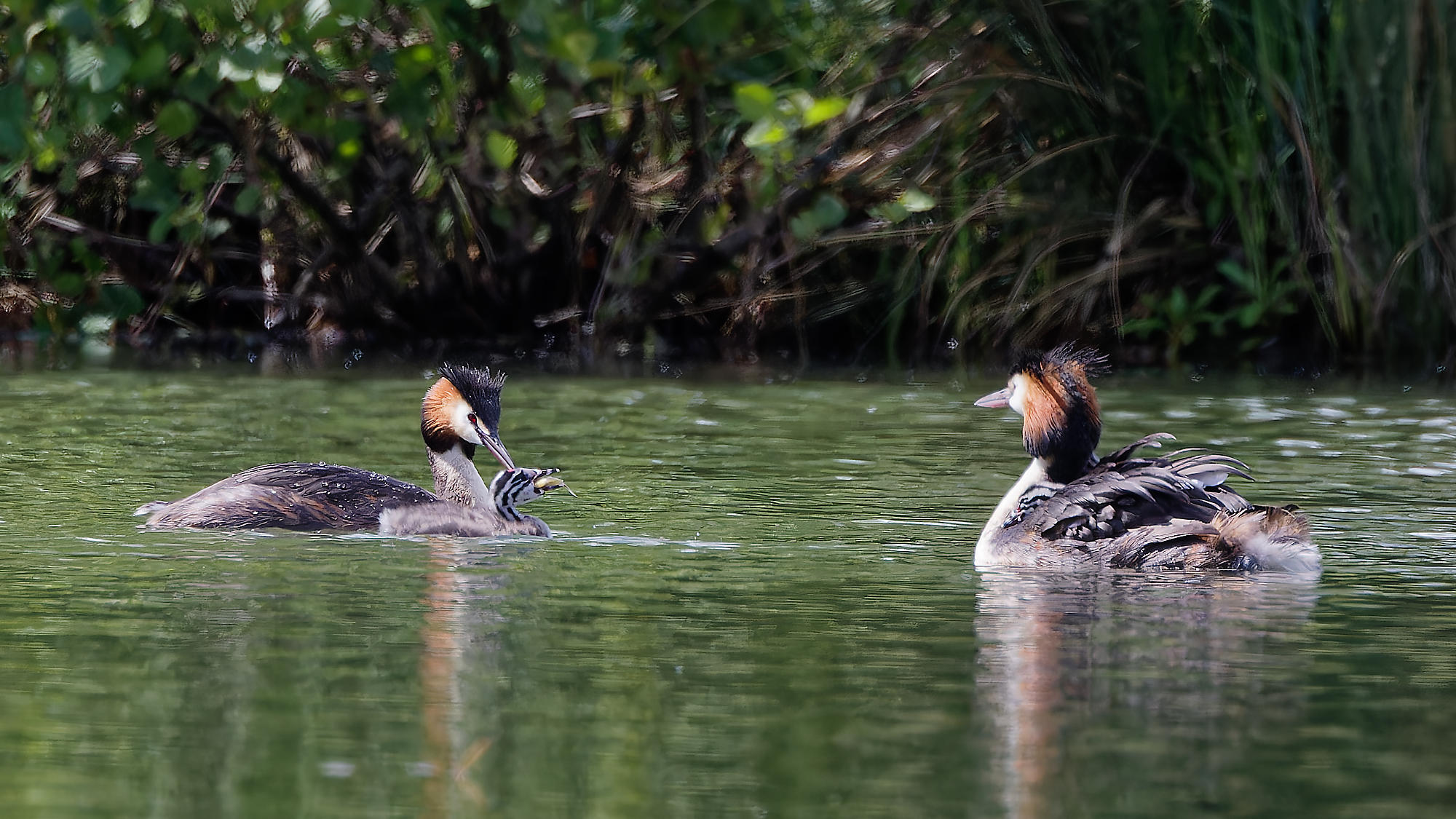Ce sont finalement trois petits grèbes qui naviguent sur l’étang sur le dos de leurs parents.