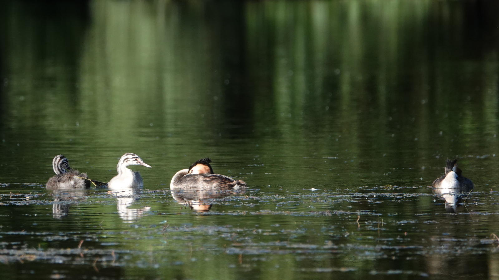 Les jeunes grèbes huppés de l’étang ont grandi et ne montent plus sur le dos de leurs parents. Ils dépendent toujours d’eux pour la nourriture, et c’est l’occasion de quelques sprints pour attraper en premier le poisson vite englouti.