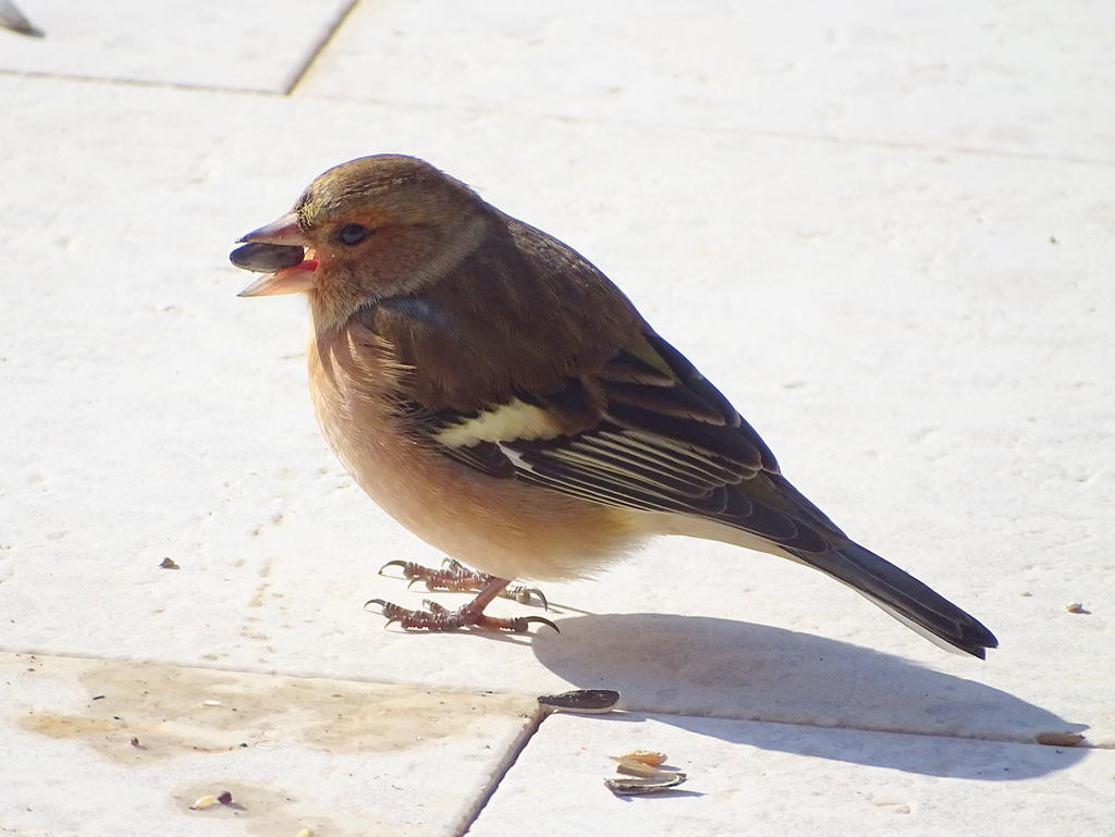 Voilà une expression bien illustrée par ce pinson venu picorer sur notre terrasse.